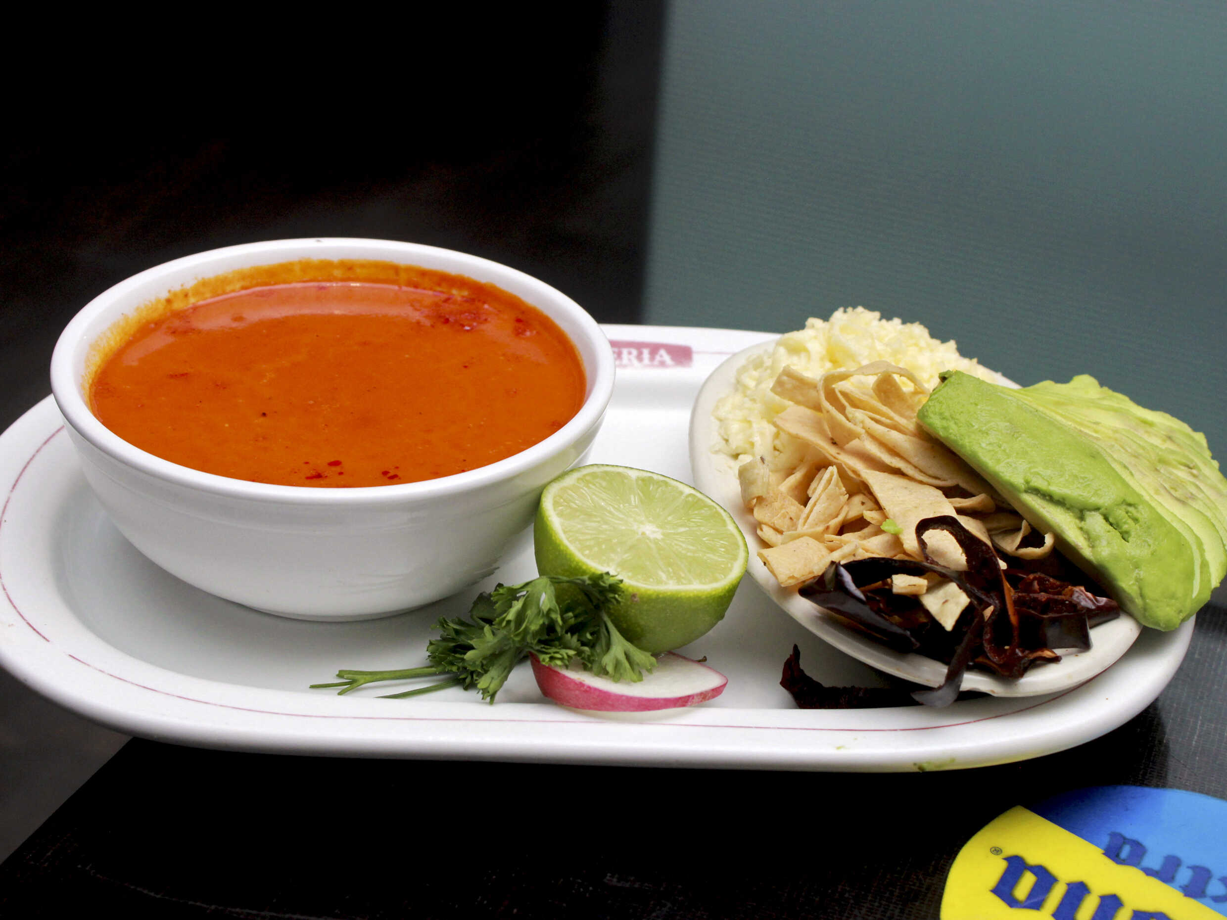 Caldo a base de chile colorin condimentado y toque de picante, acompañado de Julianita de tortilla de maíz, queso rayado y aguacate.