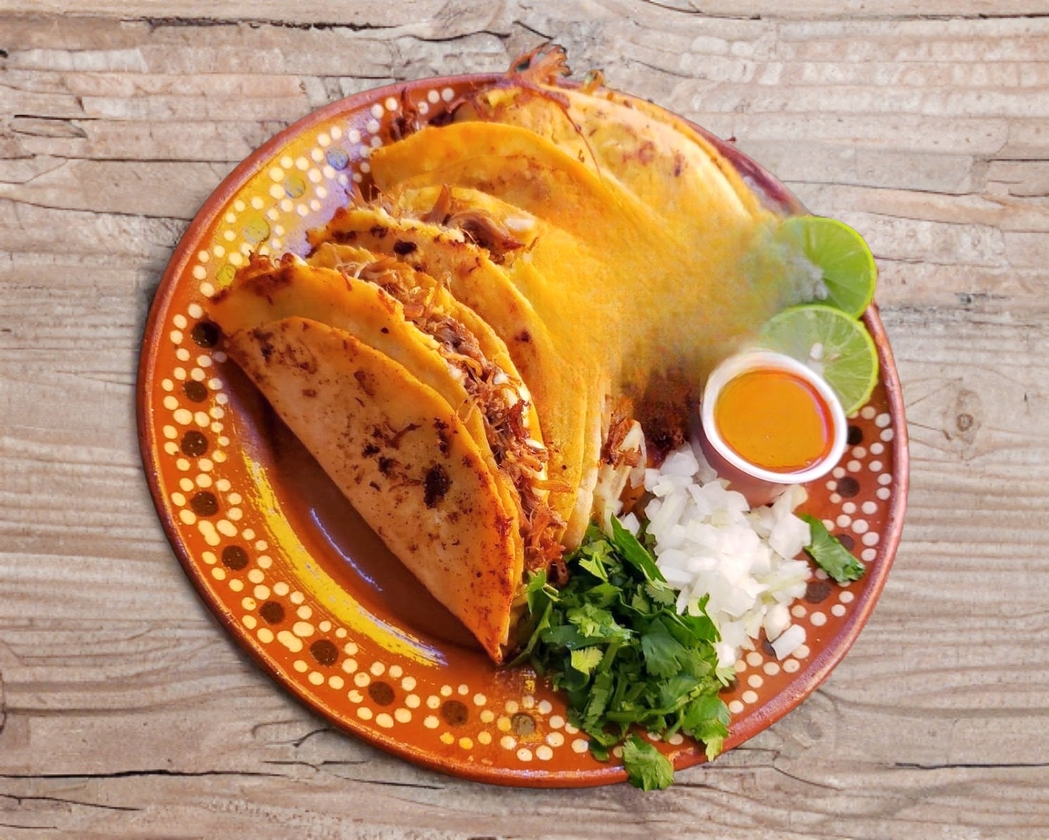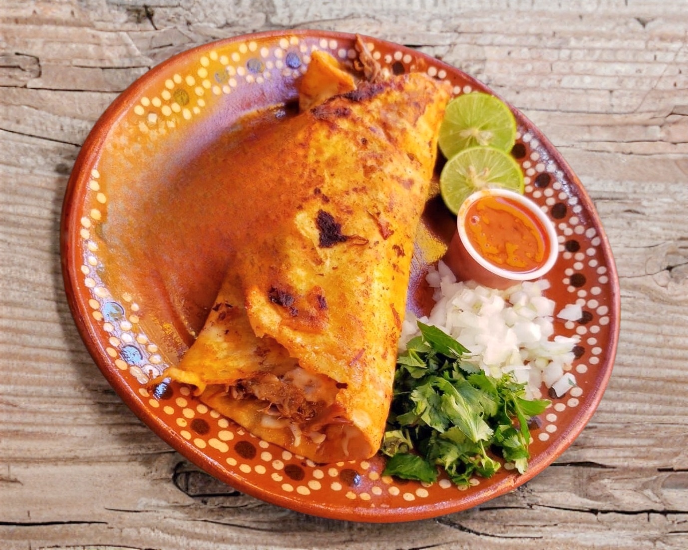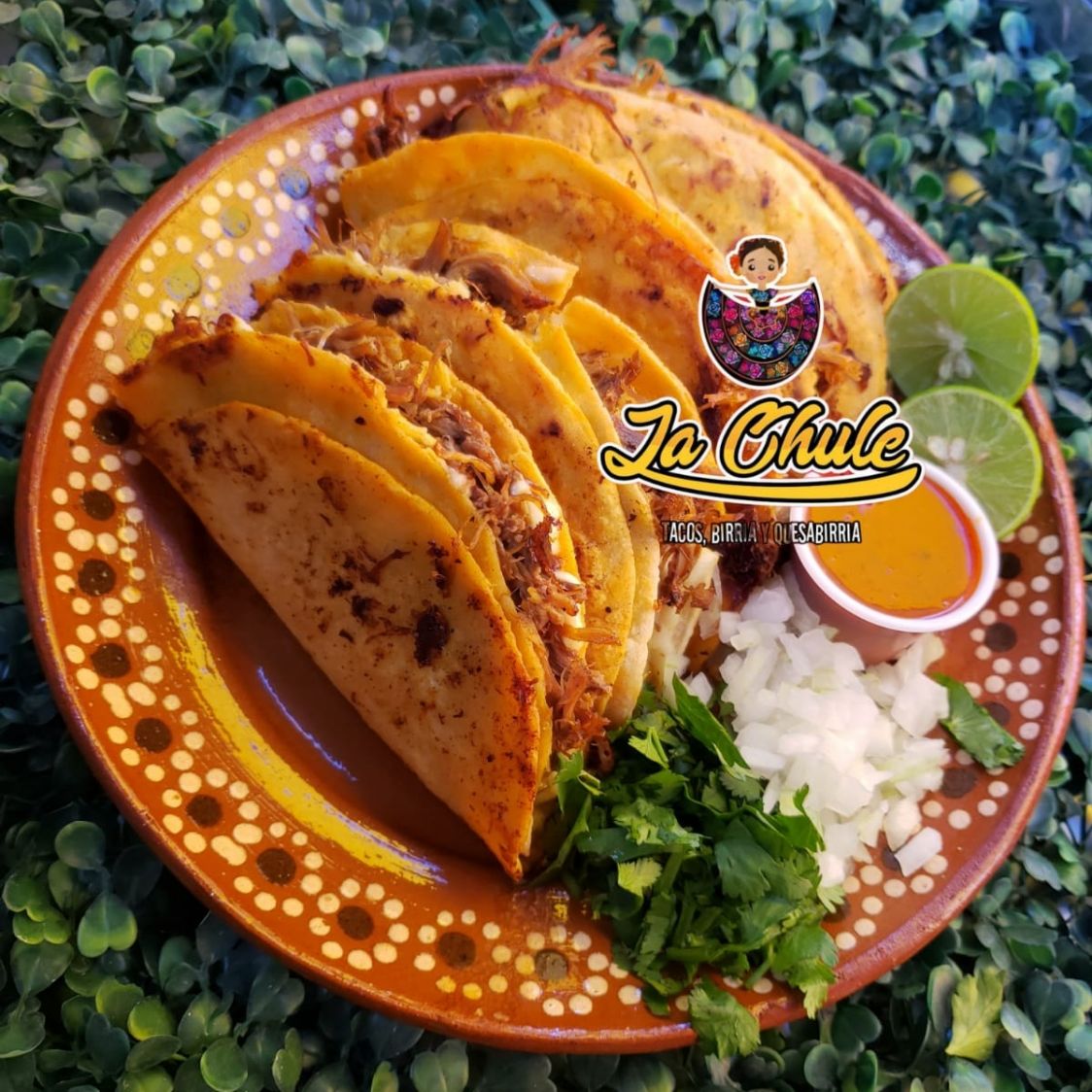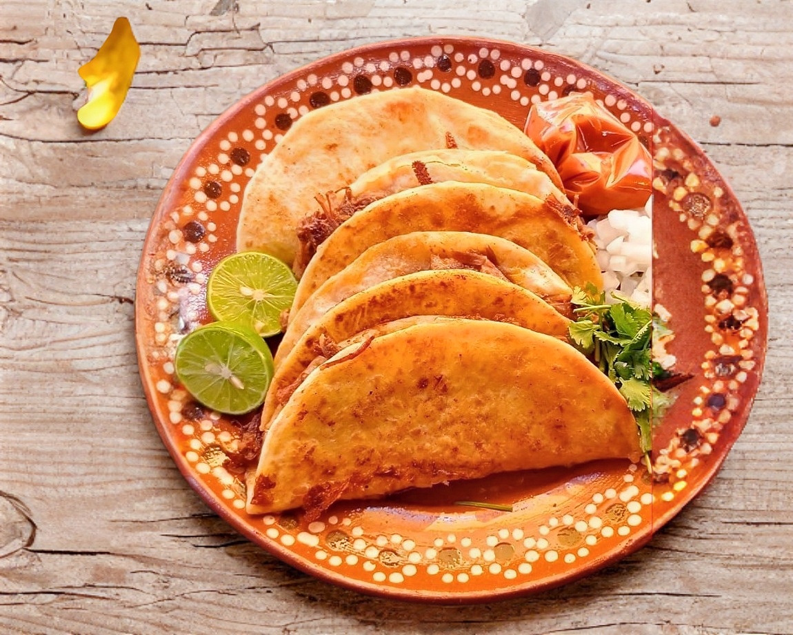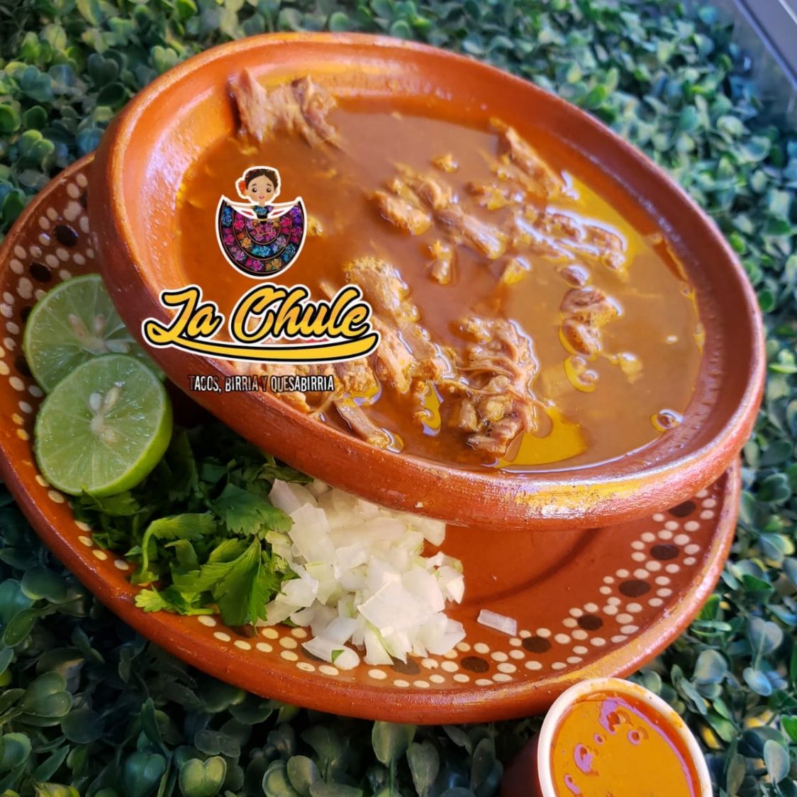 Deliciosas quesabirria de Harina Acompañadas de Consomé, limon, salsa, cilantro y cebolla.
