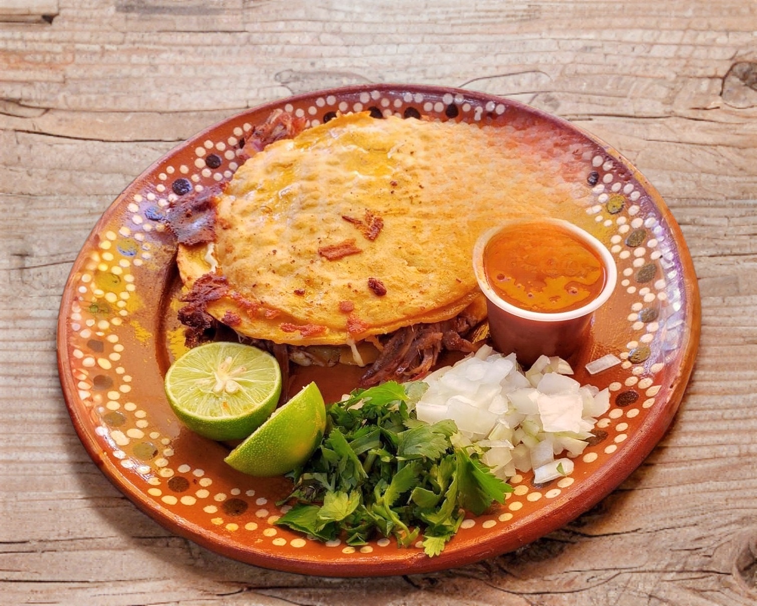 Deliciosa quesabirria con 3 tortillas, carne y queso, acompañada de consone,cebolla,cilantro, salsa y limon.