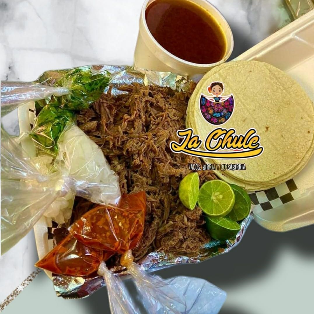 1/2 kilo de carne de birria, acompañado de 1 litro de consomé , tortillas, salsa, limón y cebolla.