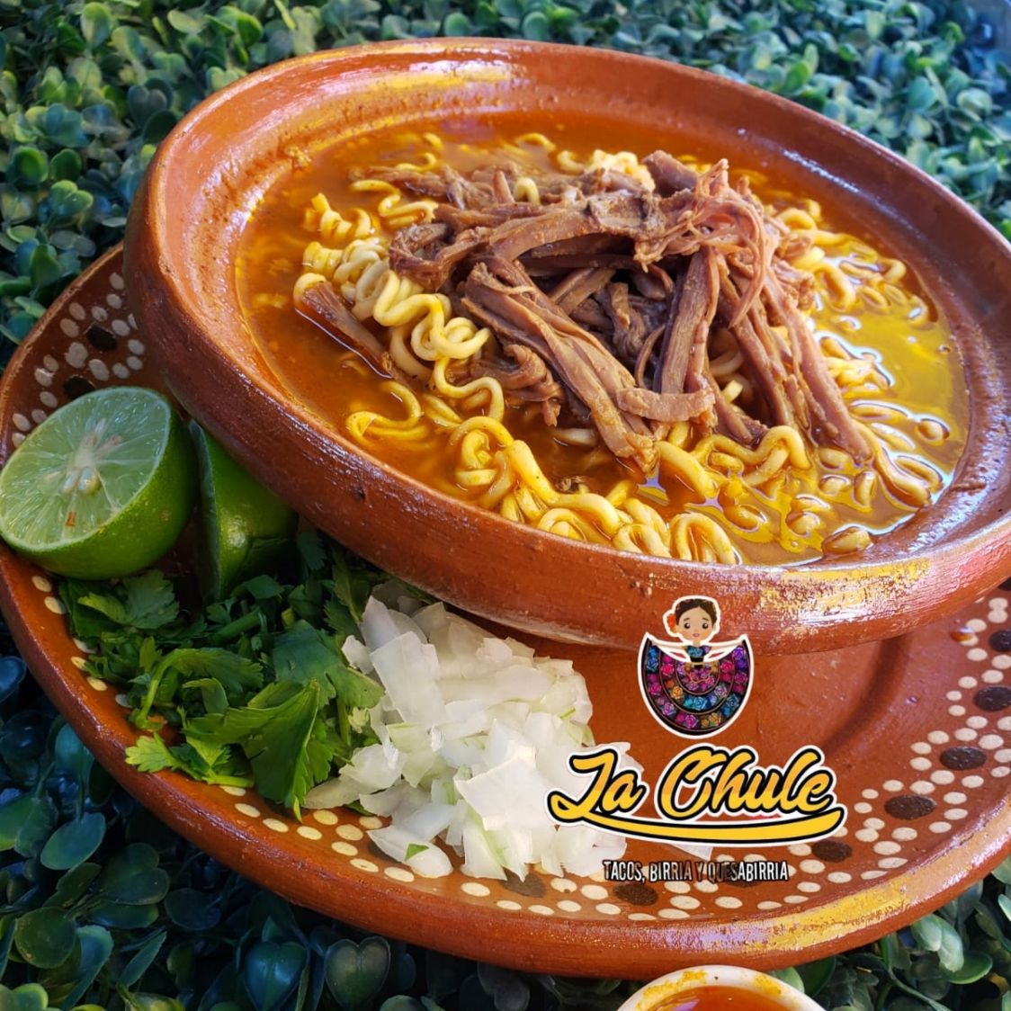 Delicio ramen con consomé de birria, preparado con 90gr de carne y el toque de la casa, acompañado de cebolla, cilantro, salsa, limones y tortillas.