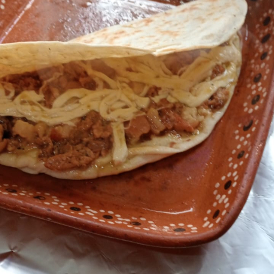 quesadilla de arina con puerco en rojo con papas y queso oaxaca gratinado