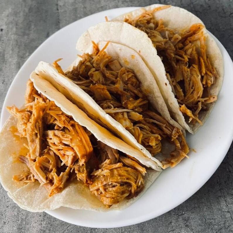 3 deliciosas tortillas de maiz con nuestra exquisita cochinita pibil, acompanados de limon, habanero y cebollita morada