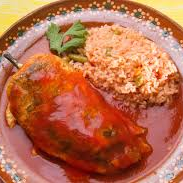 Chile poblano relleno de queso, acompanado de arroz y frijoles