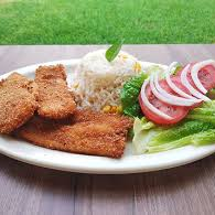 Filete de pescado empanizado acompanado de arroz y ensalada