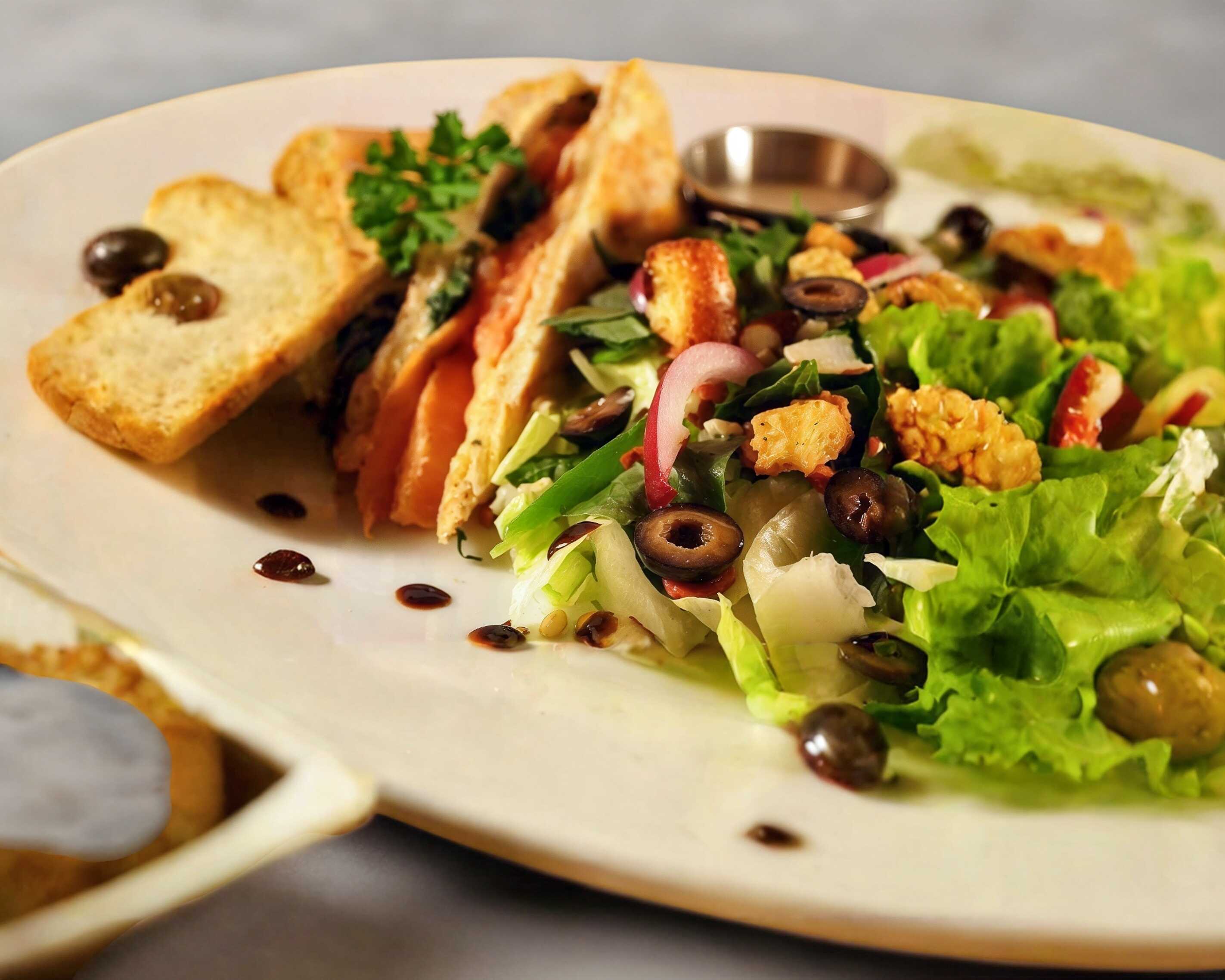 Mix de lechuga, espinaca, pechuga de pollo, 4 quesos, aceitunas negras y crotones.