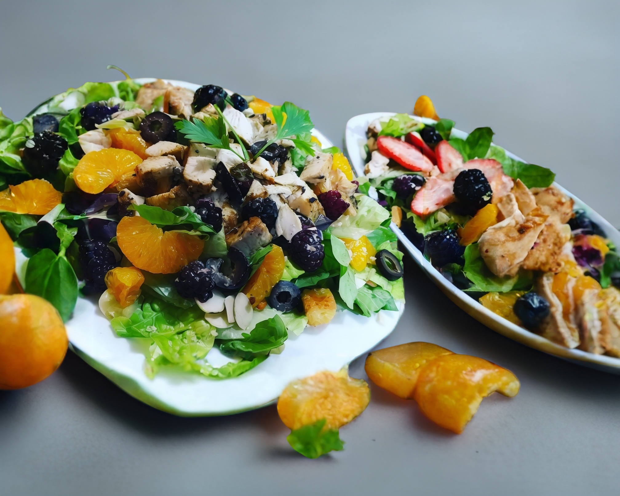Lechuga, espinaca, cubos de fruta, almendras, parmesano y aderezo.