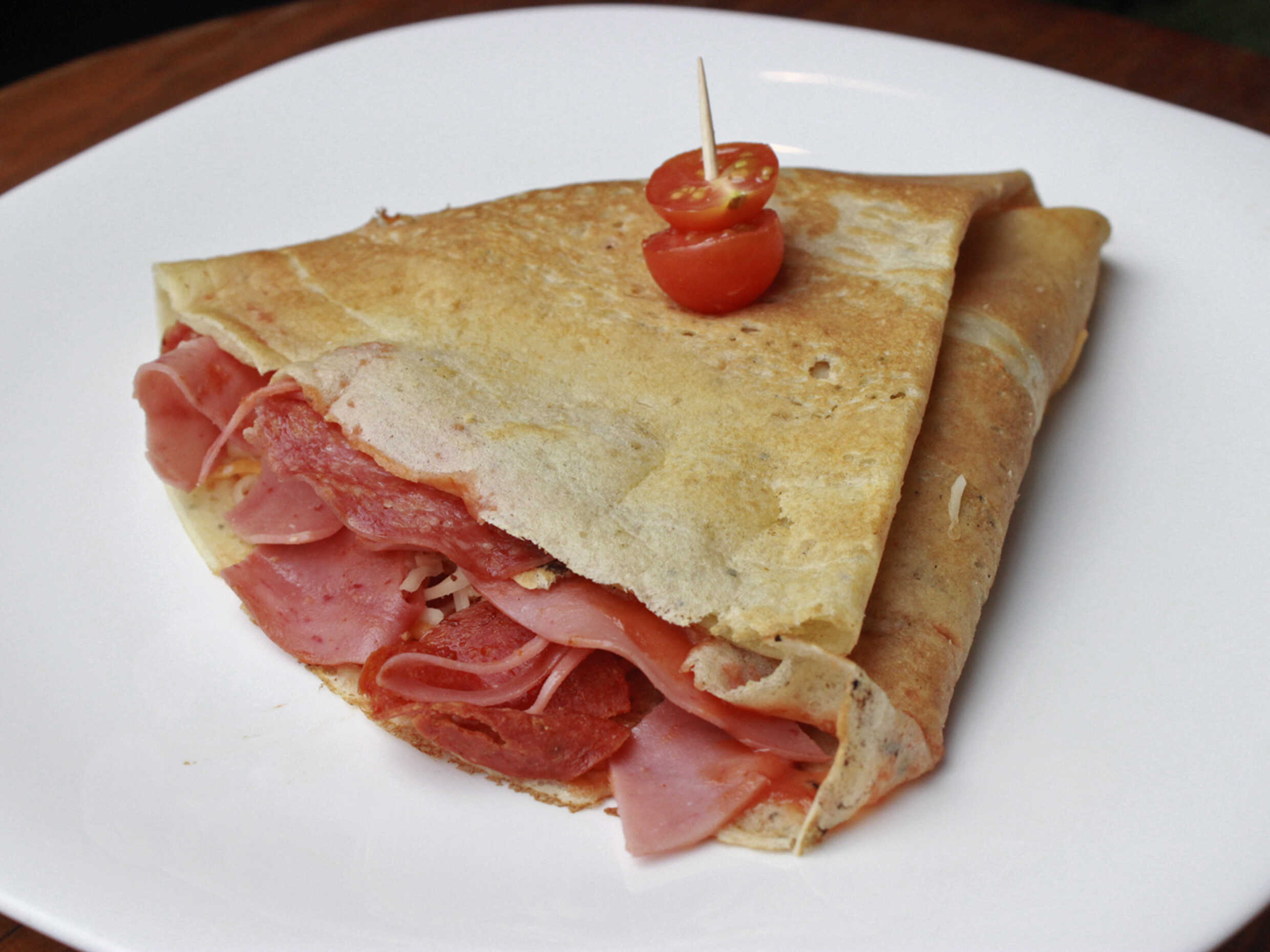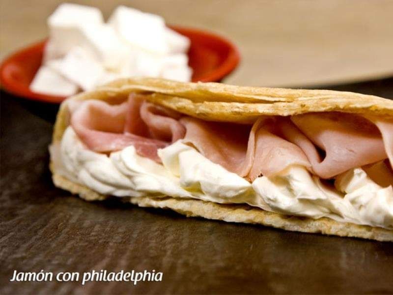 Pan chapata, jamón, salami, pepperoni, salsa de la Casa, 4 quesos, Chips y ensalada.