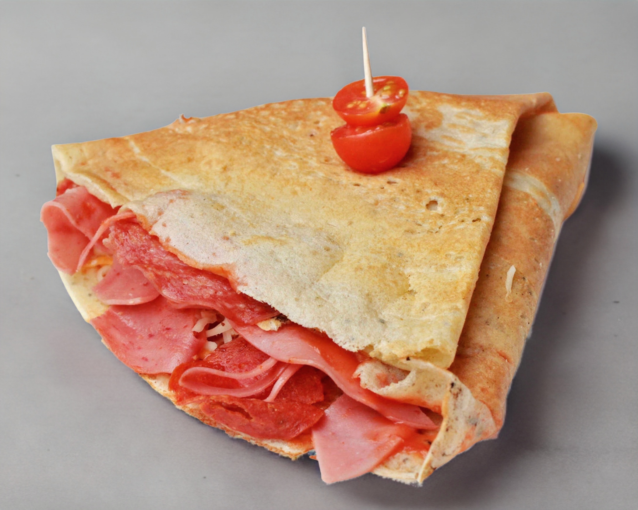 Salami, pepperoni, jamón, salsa tomate y 4 quesos.