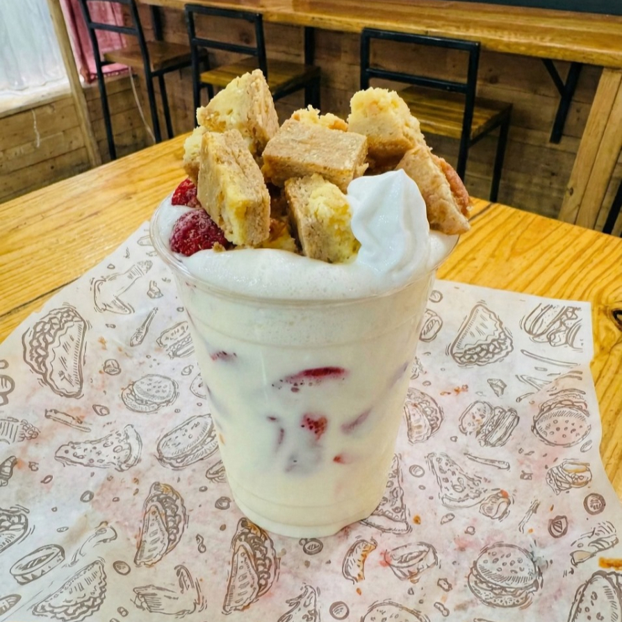 Fresas Naturales, Crema, Crema Batida, Brownie y Galleta.
