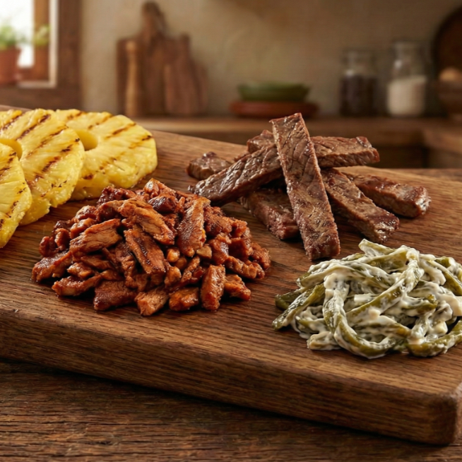 Rollo de Jamon con Queso Chihuahua y Camarones, Queso Cheddar, Frijoles, Tocino y Liquidos