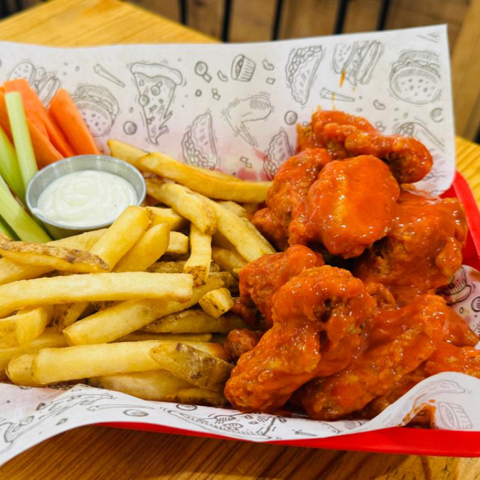 9 a 10 pz, 220 gr de Papas Fritas, 2 oz de Ranch, Palitos de Apio y Zanahoria