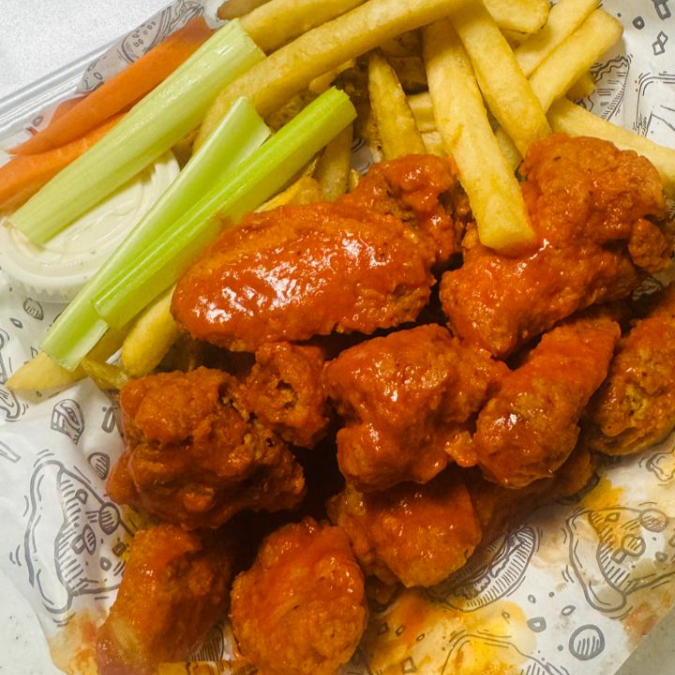350 gr Boneless de pechuga de pollo, 220 gr de Papas Fritas, 2 oz de Ranch, Palitos de Apio y Zanahoria