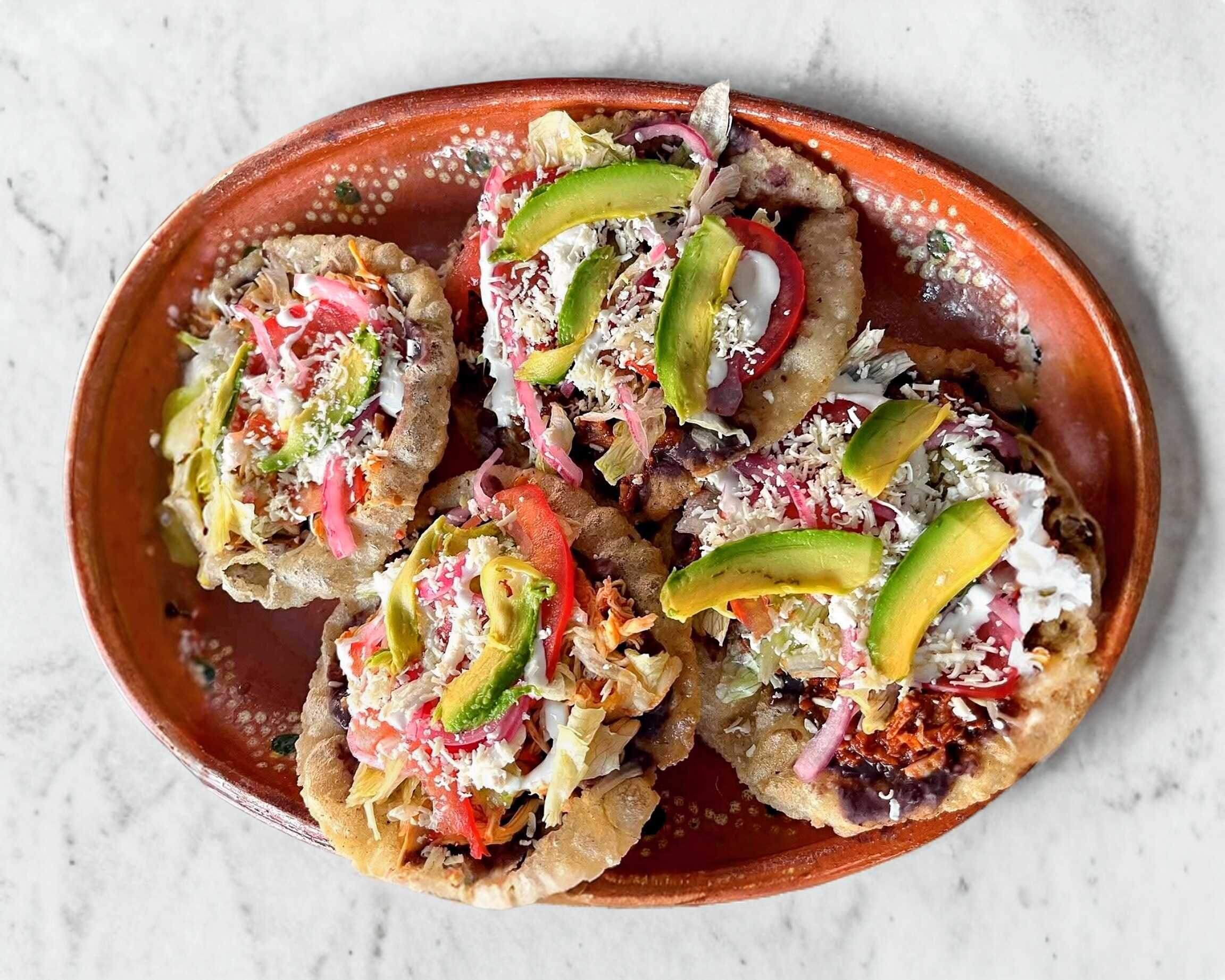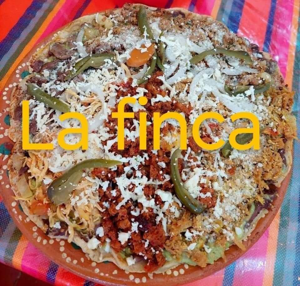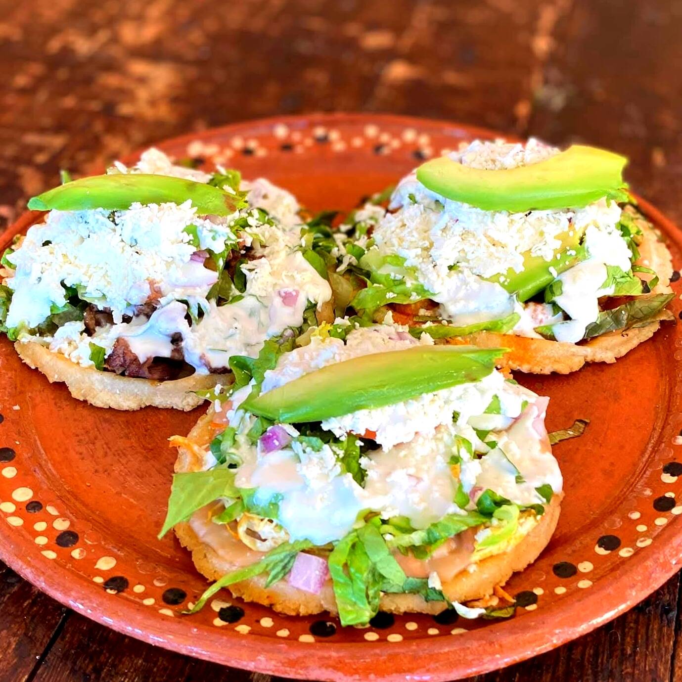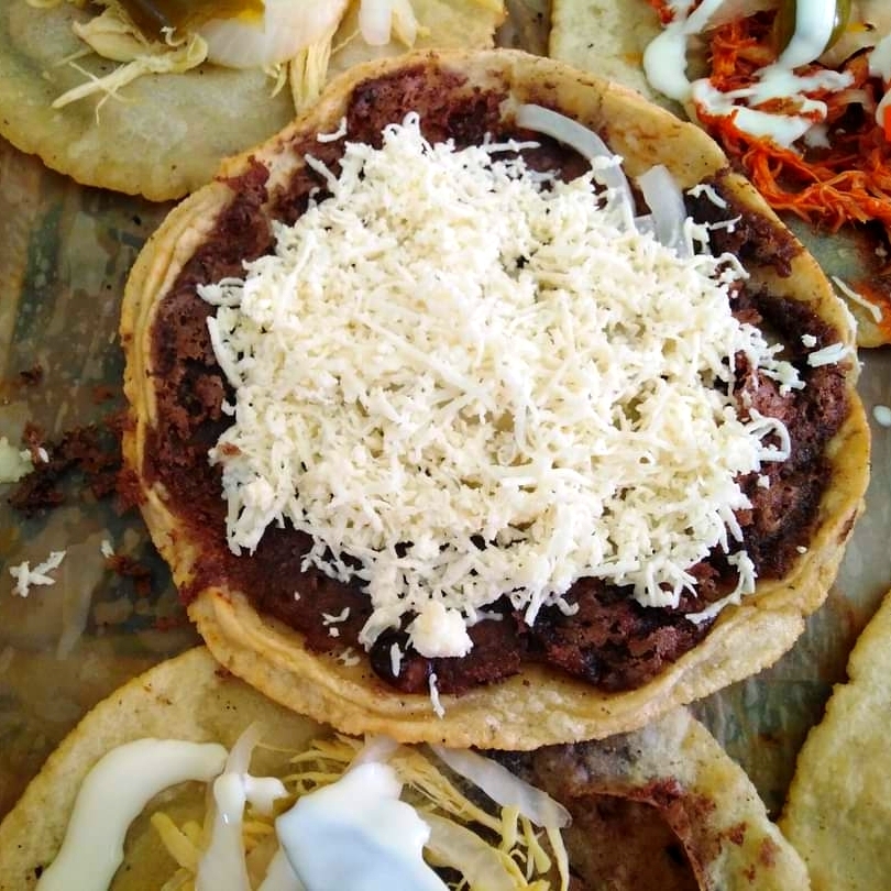 Tortilla de maiz 100% pasada en comal , base de frijoles negros queso de hebra, chinameca huevo hervido, plátanos fritos, aguacate, crema y queso fresco