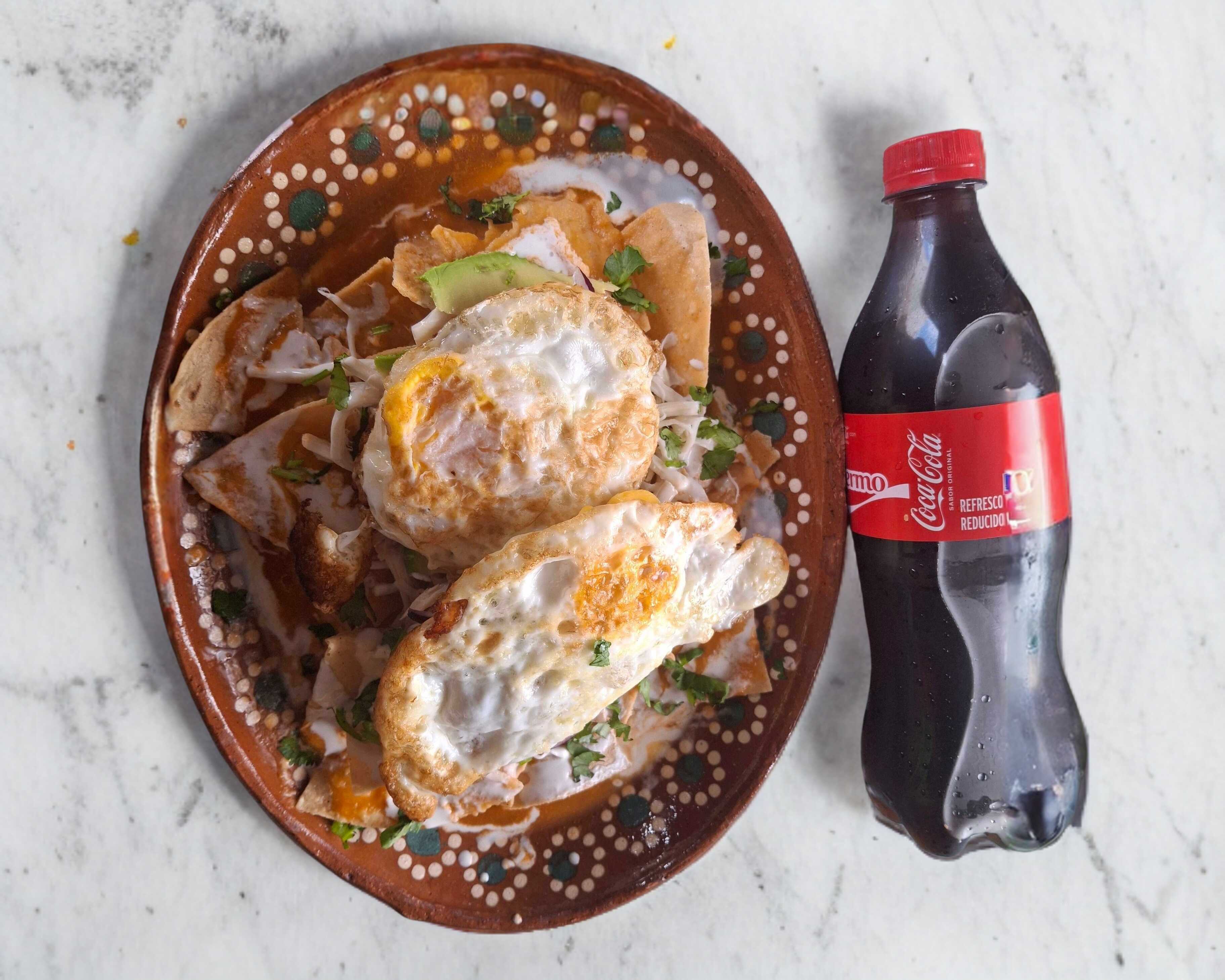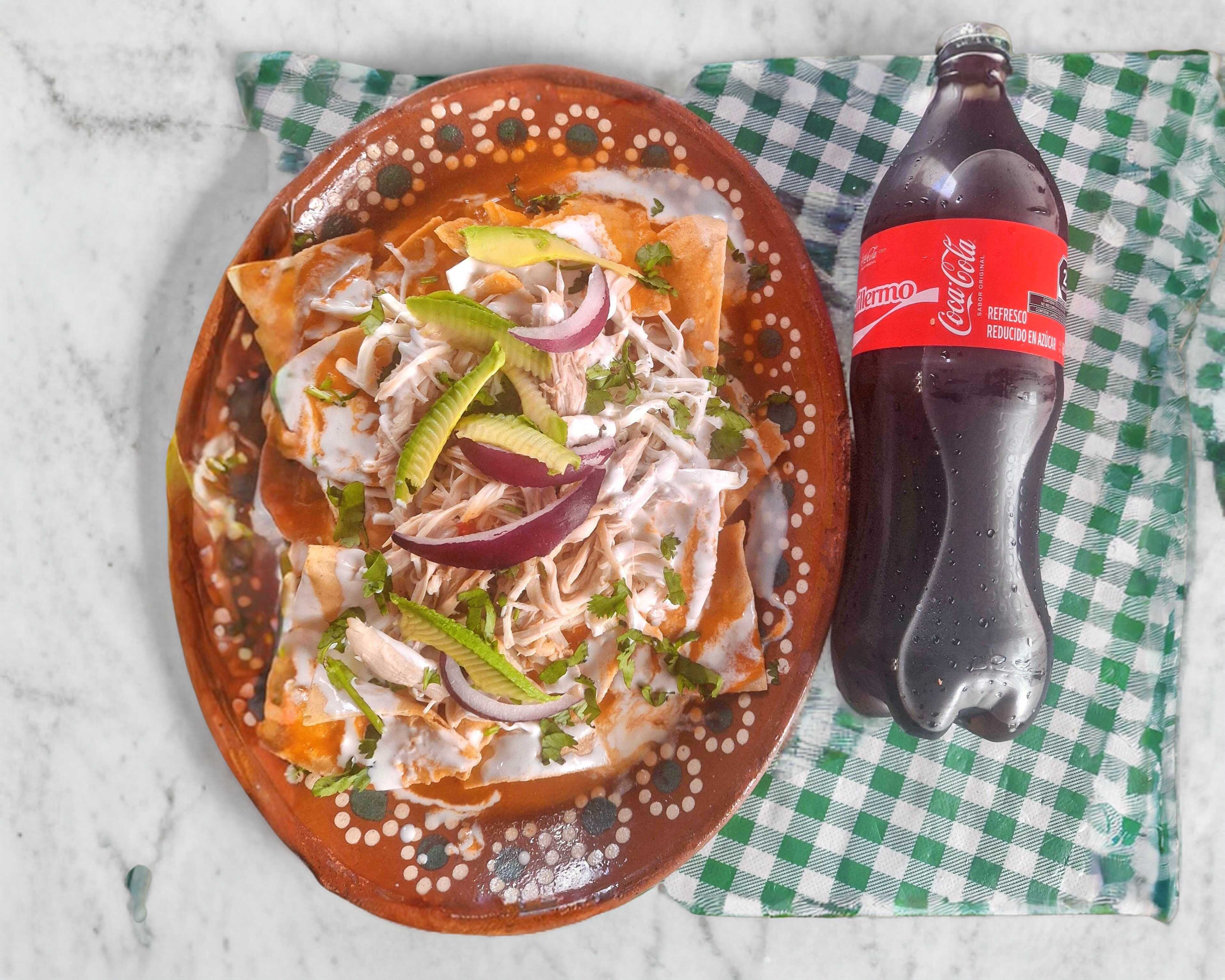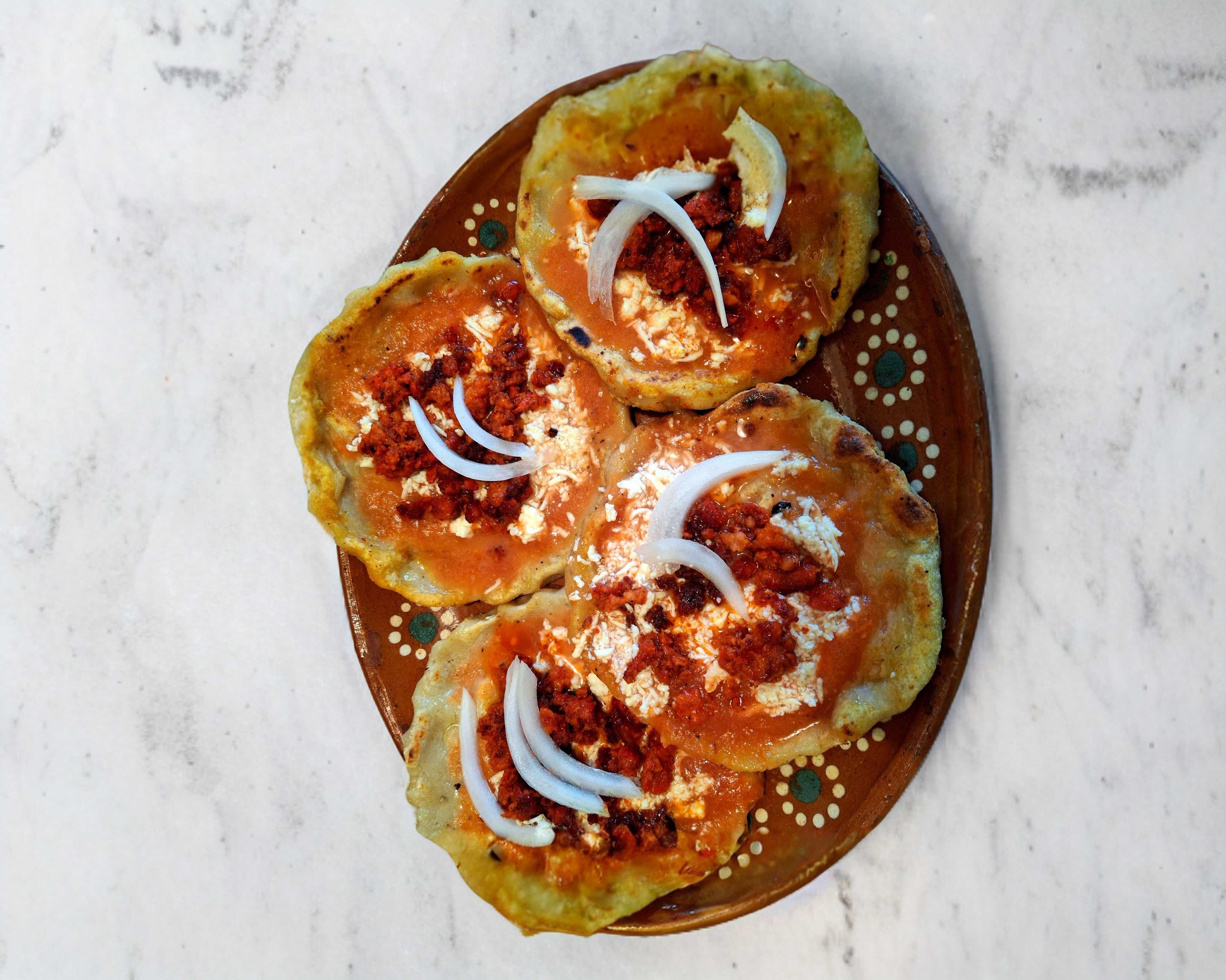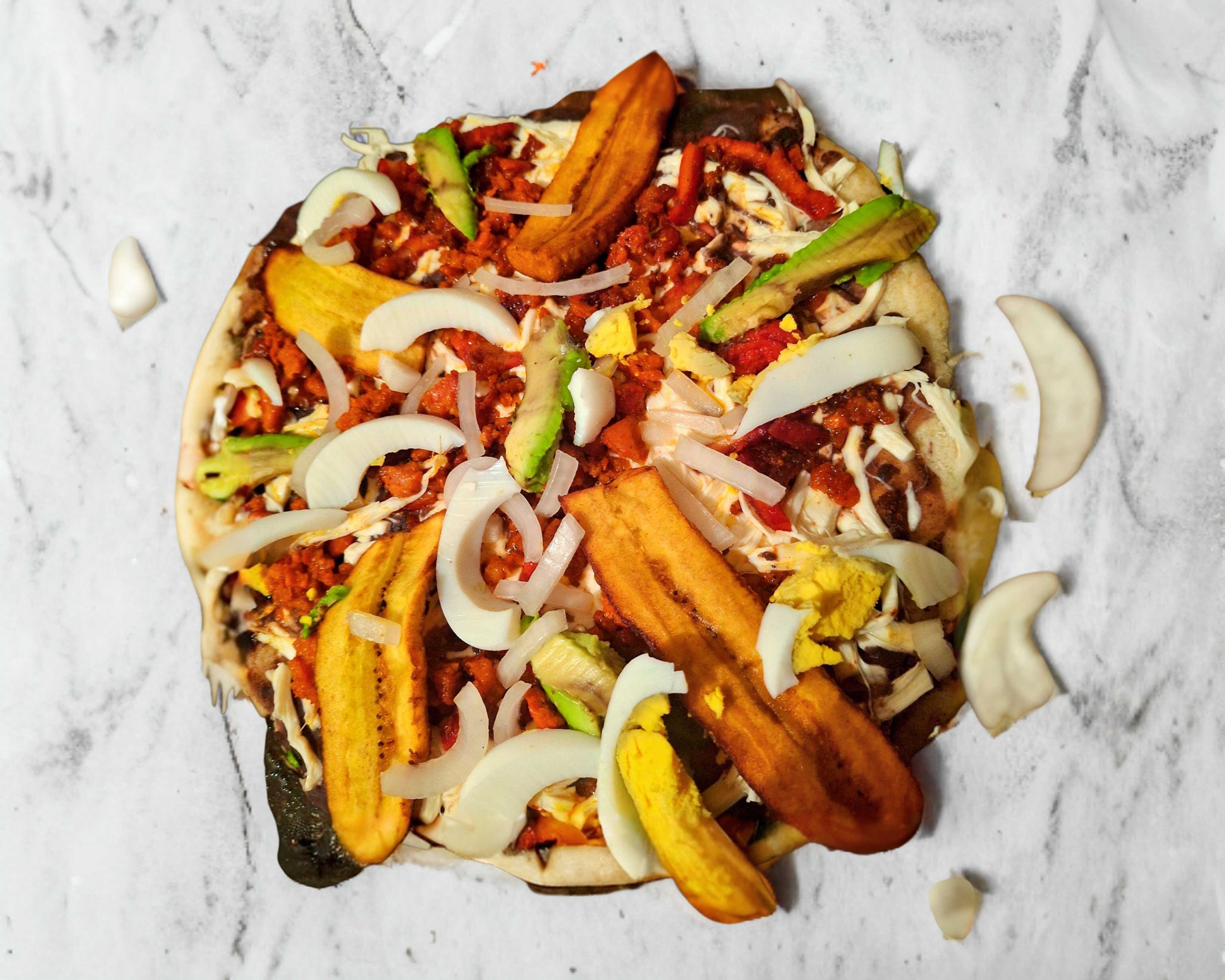 Tortilla de maiz 100% pasada en comal , base de frijoles negros queso de hebra, chinameca huevo hervido, plátanos fritos, aguacate, crema y queso fresco