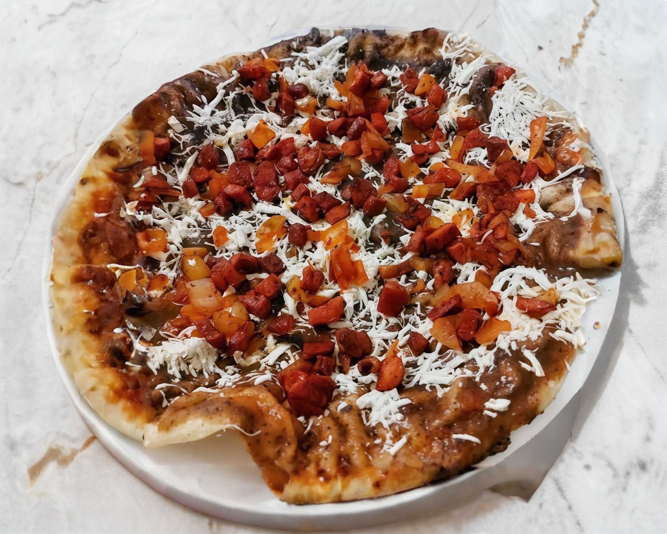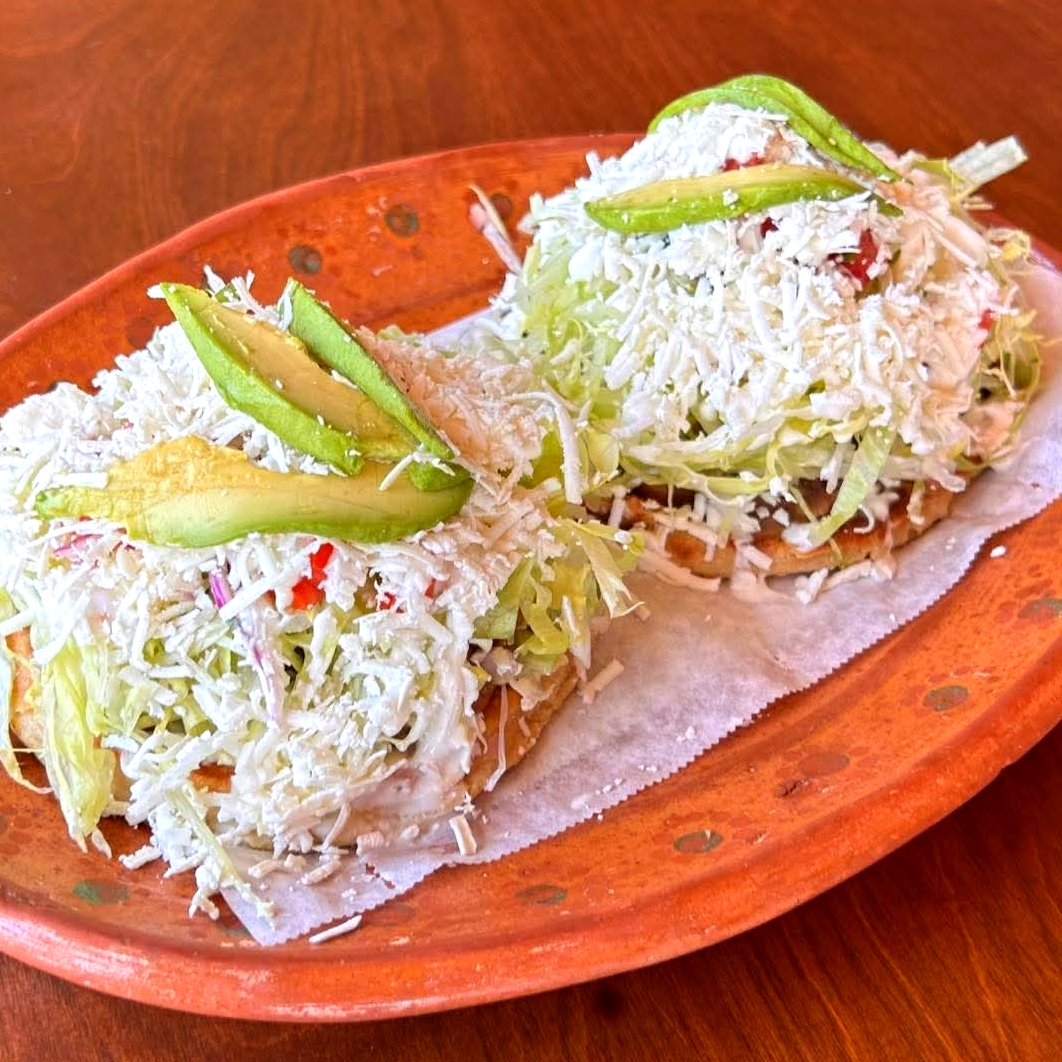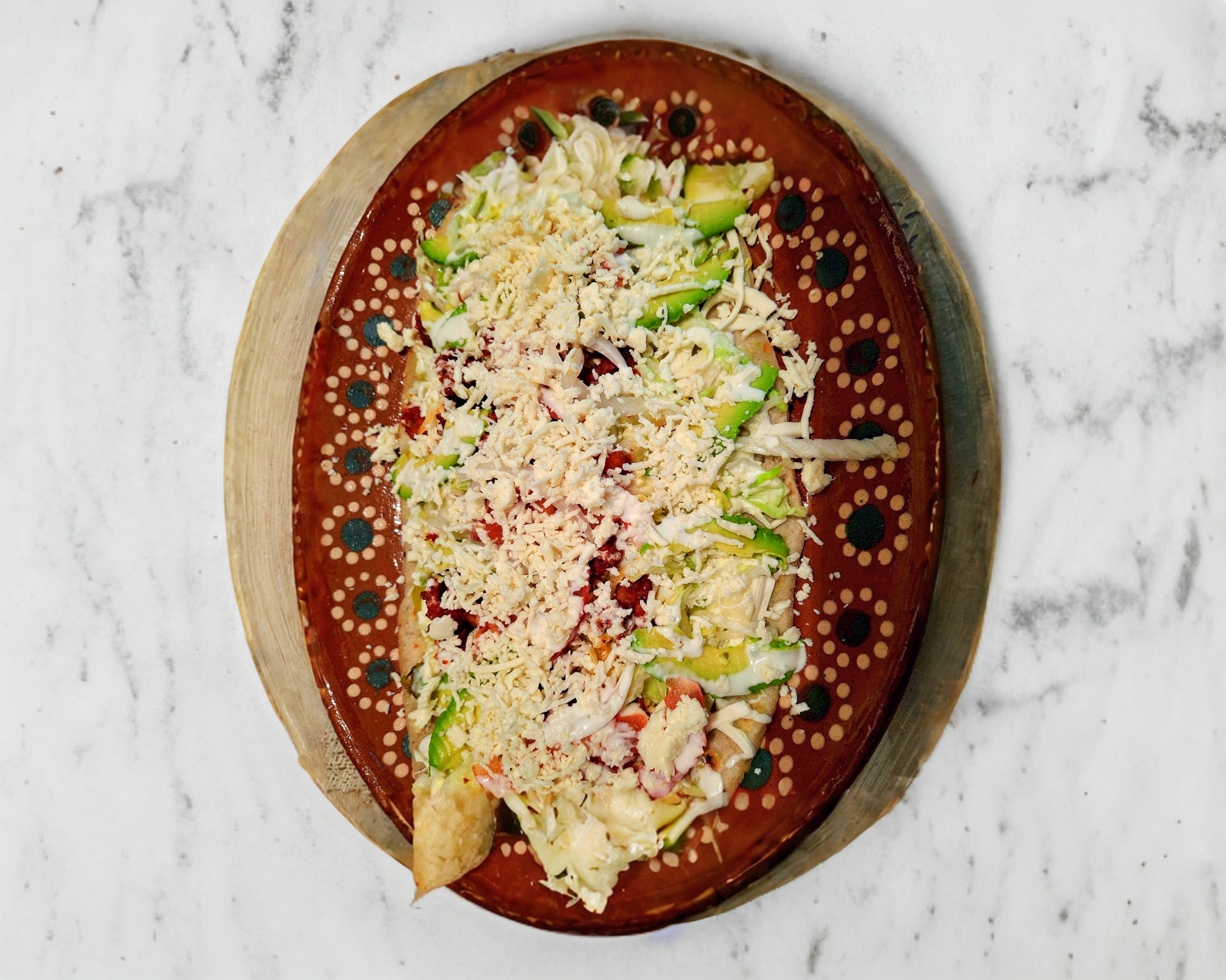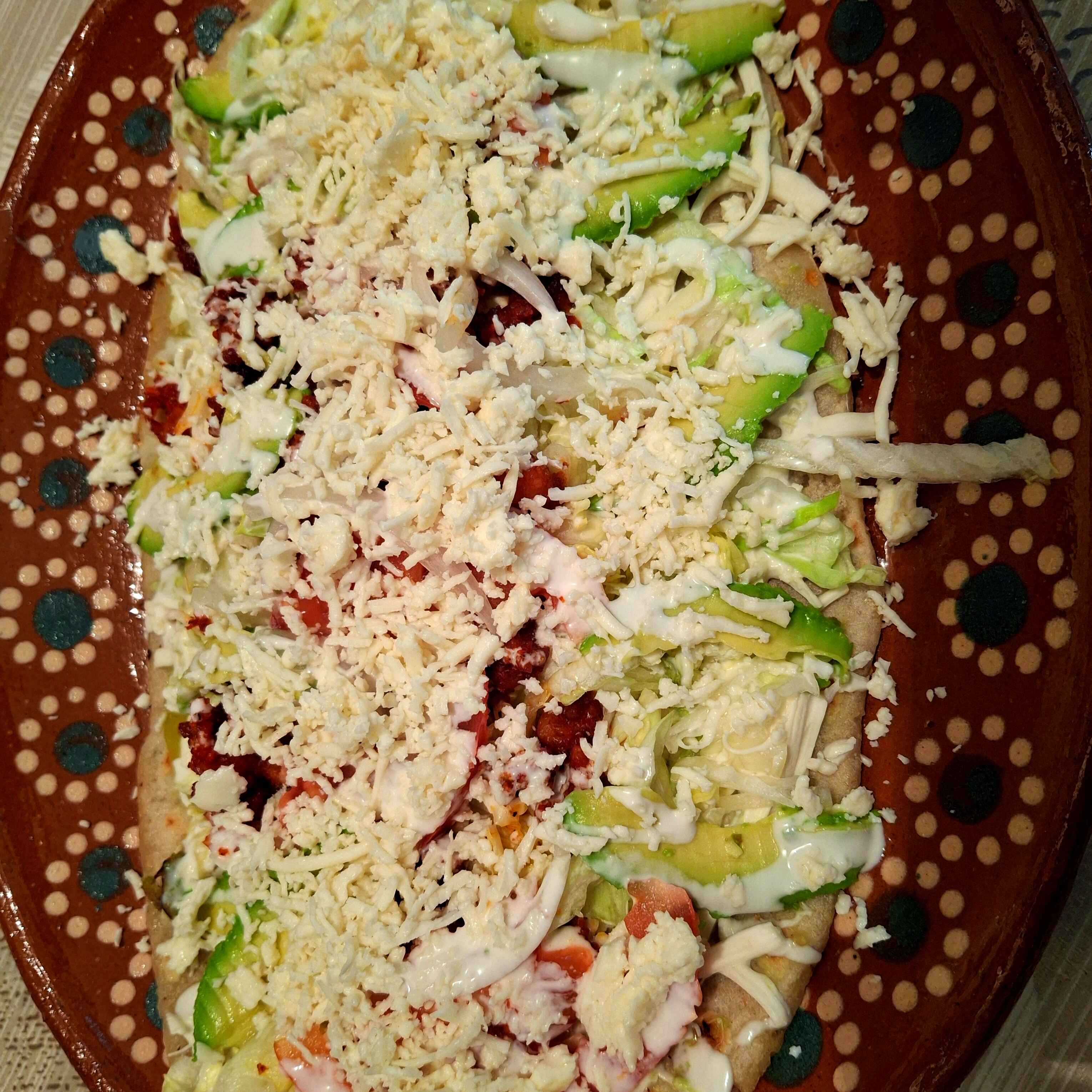 Base de aguacate, queso hebra, longaniza, chinameca, carne molida, pollo, queso fresco y chiles curtidos tamaño jumbo
