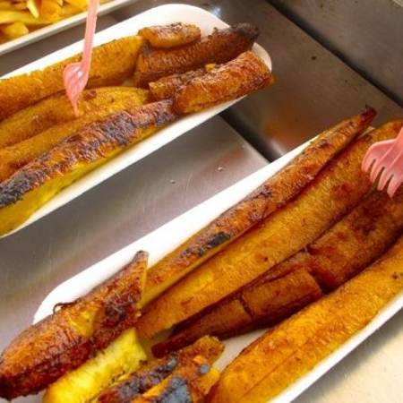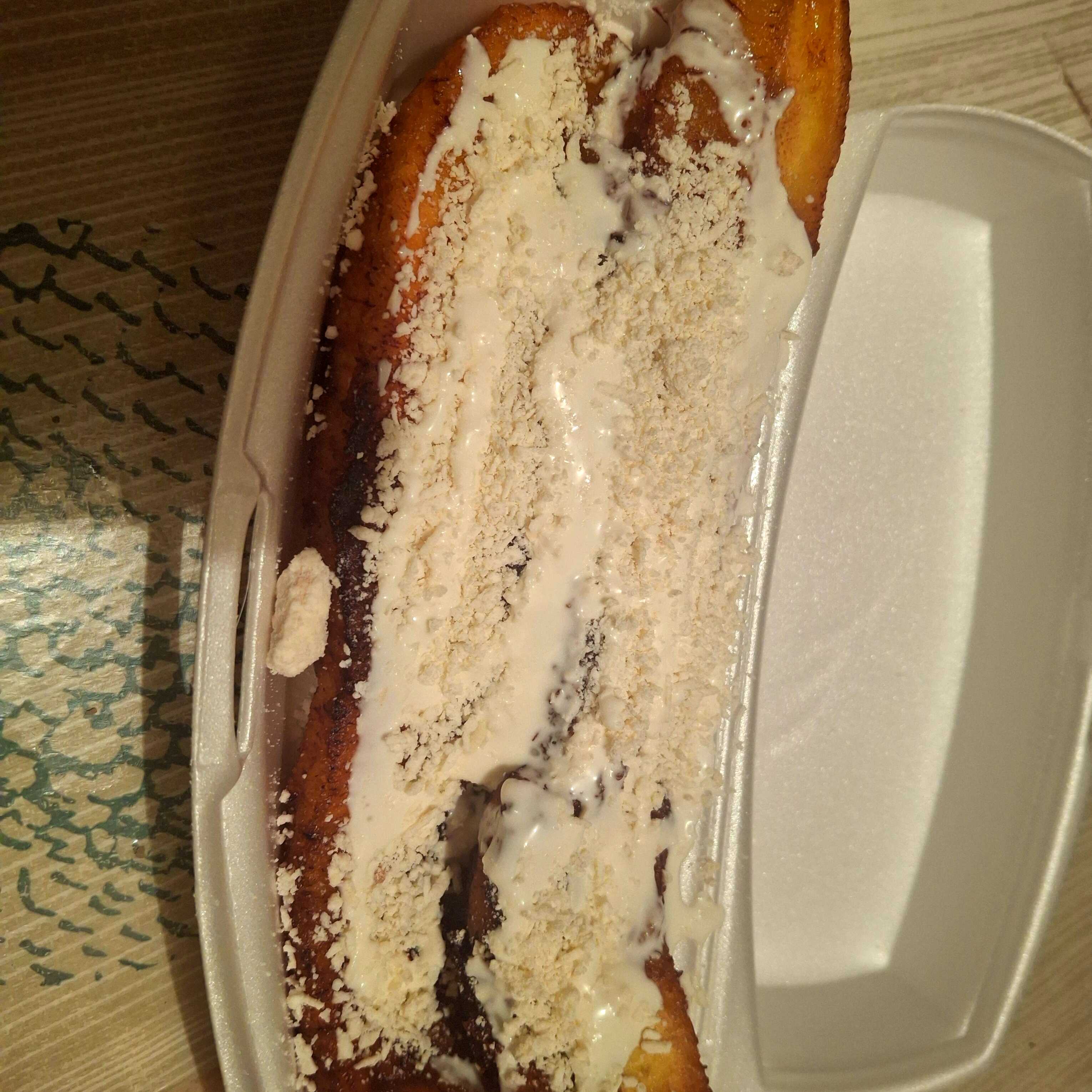 Memela base de frijoles negros , salsa de tomate queso de hebra longaniza , huevo hervido platanos fritos crema y queso