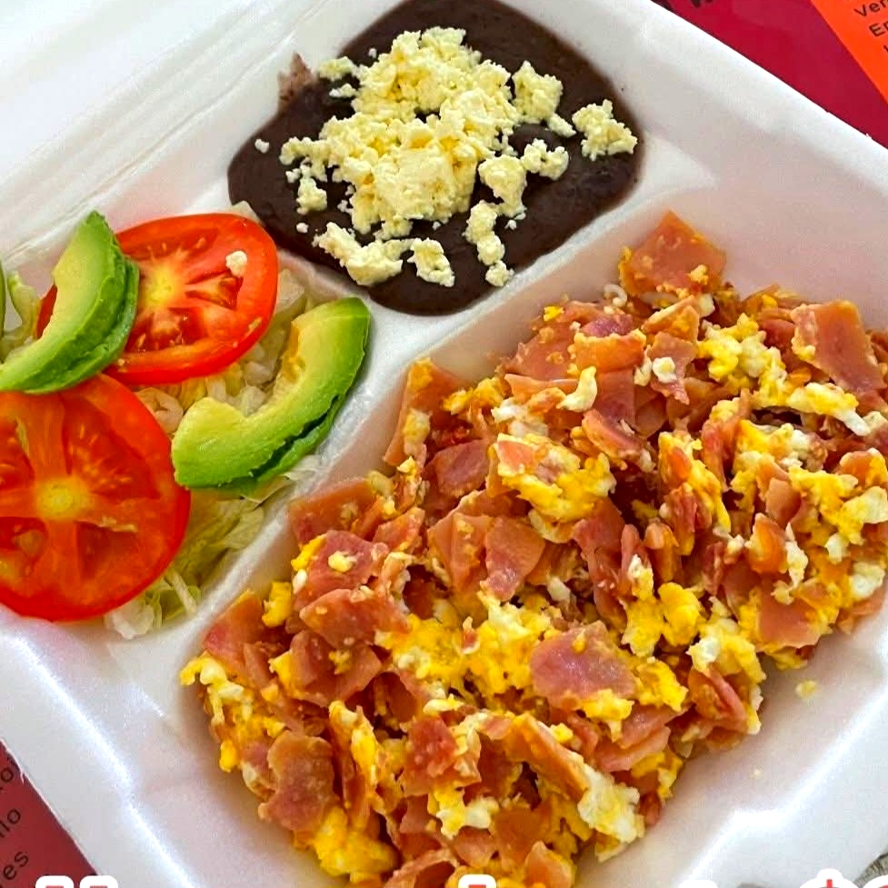 Ricos huevos revueltos , con su ricos frijoles negros refritos y su ensalada y 2 tortilla de maiz hecha a mano