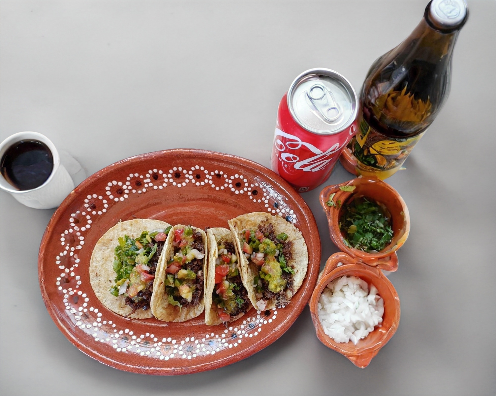 4 Tacos Bistec: salsa, cebolla, cilantro, limón.