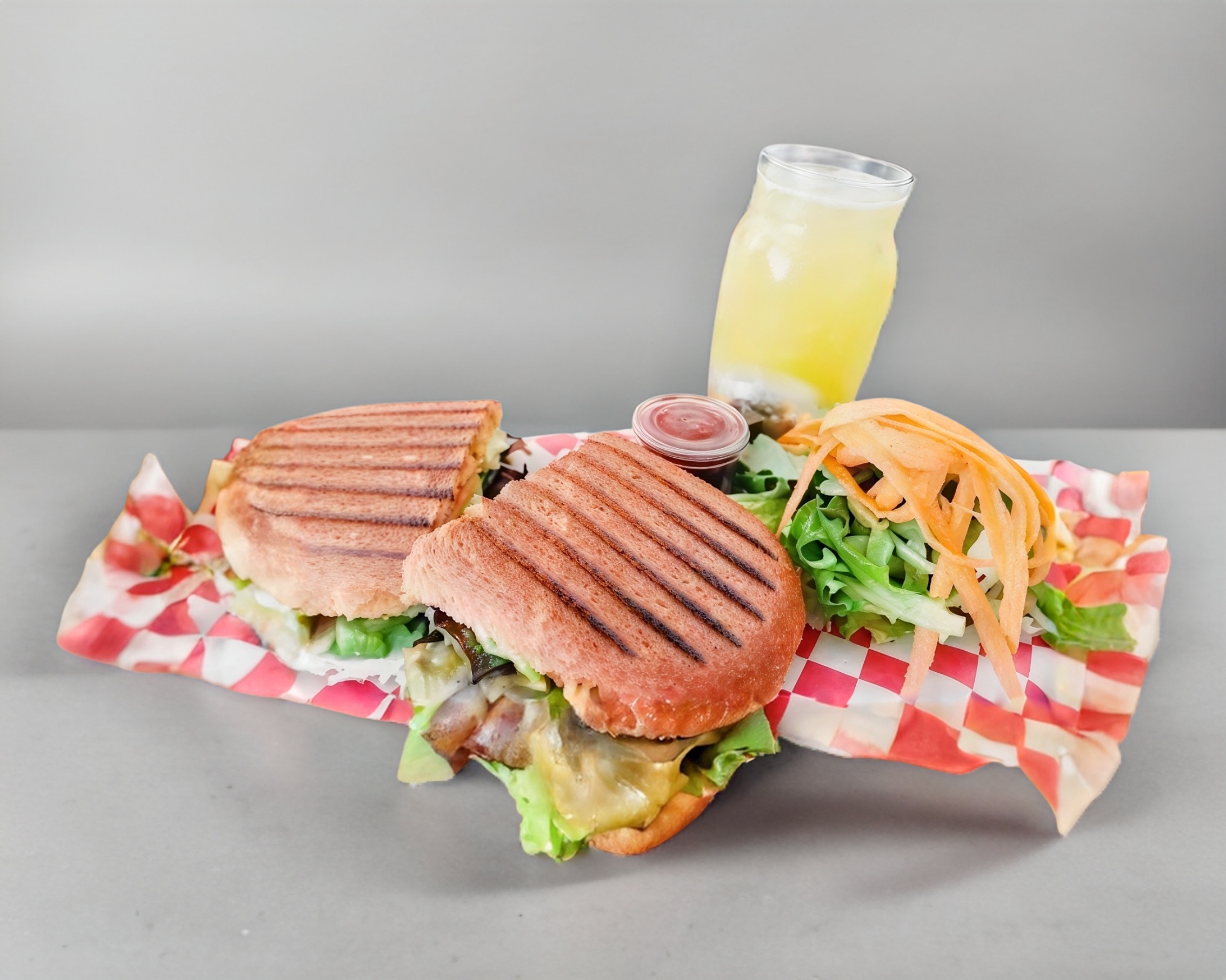 Pan artesanal, 1 huevo orgánico en torta, jamón sin gluten, queso mozzarella, tomate, cebolla morada y mix de verduras orgánicas. Acompañado de una pequeña ensalada aderezo y chiles jalapeños.