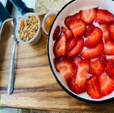 Pan ezequiel con plátano y fresa bañados en miel de agave.