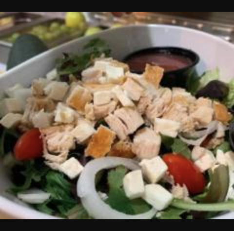 Trozos de pollo a la plancha, cebolla, cilantro, arándano, tomate cherry y mix de verduras.