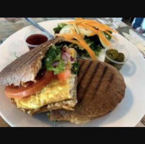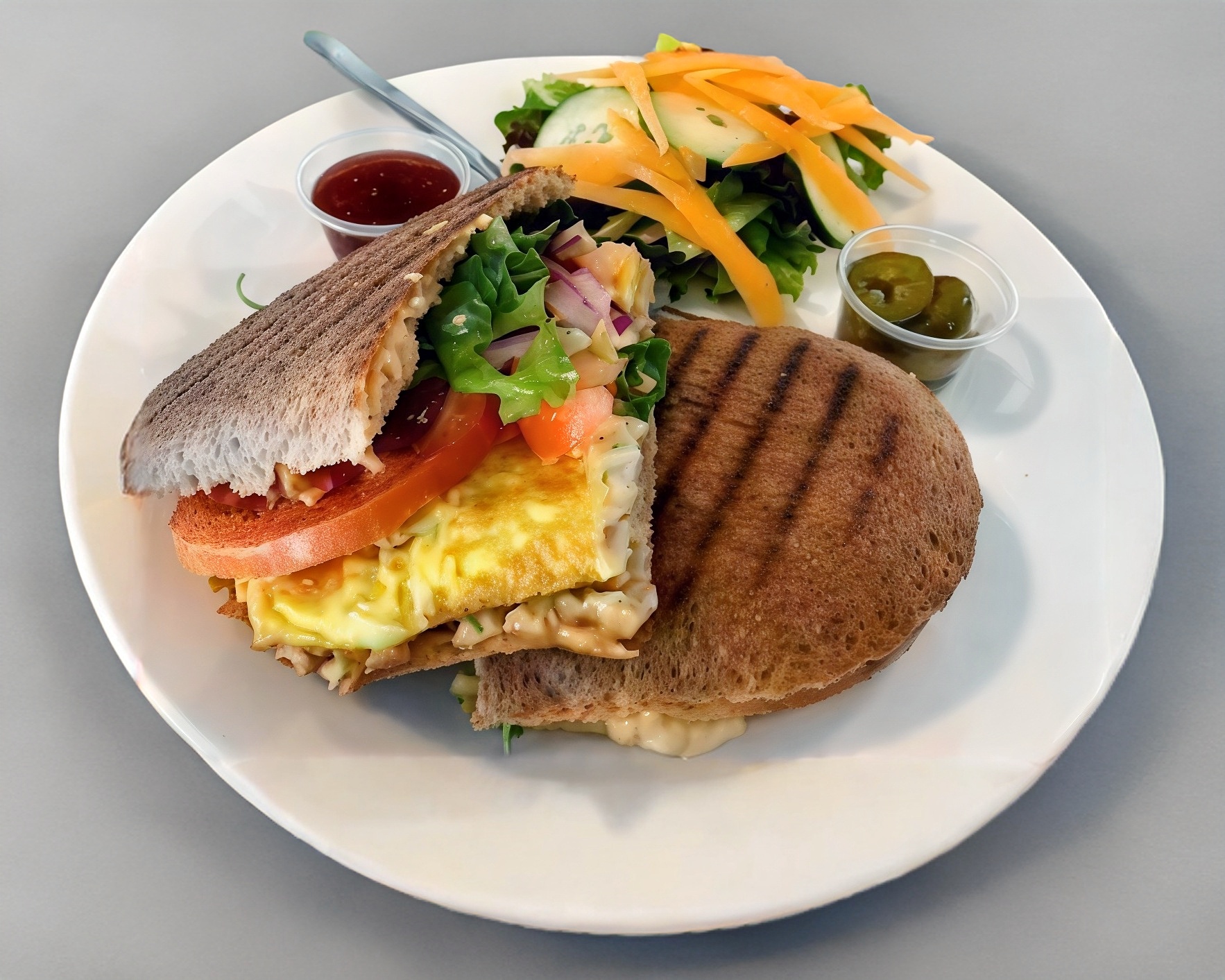 Pan artesanal, 2 huevos orgánicos en torta, queso mozzarella, zanahoria, tomate, mix de verdura orgánicas, acompañada de una pequeña ensalada, aderezo y chile jalapeños.