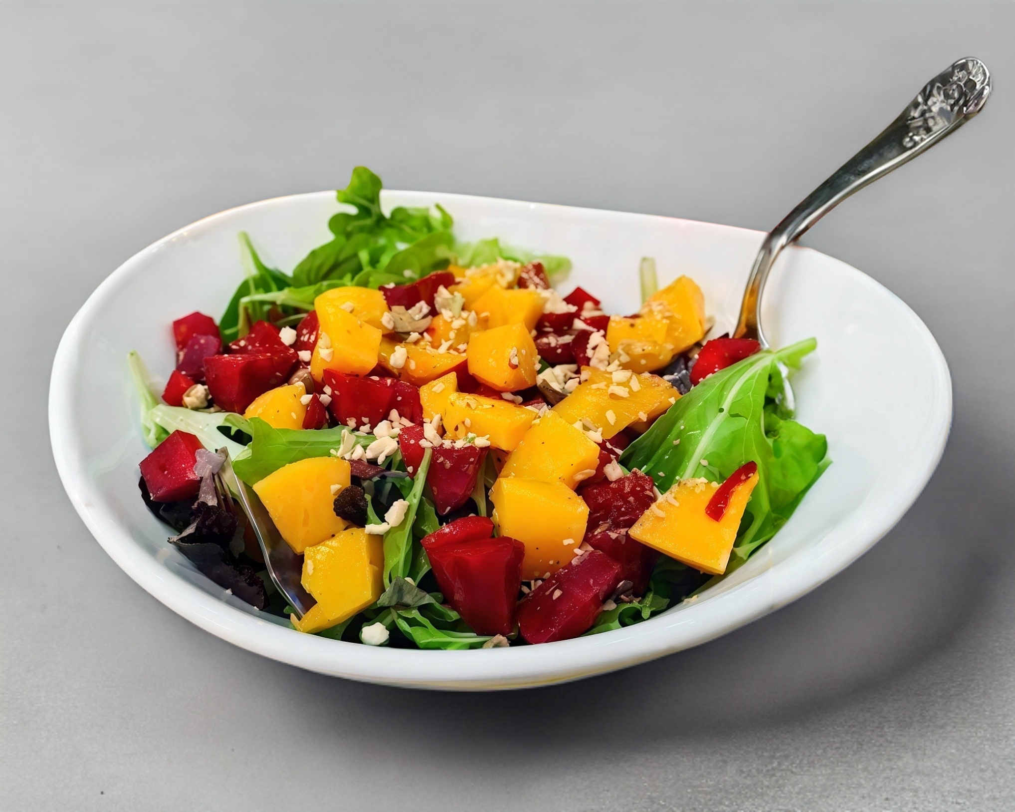 Mix de verduras, betabel, nuez caramelizada, durazno y mix de verduras.