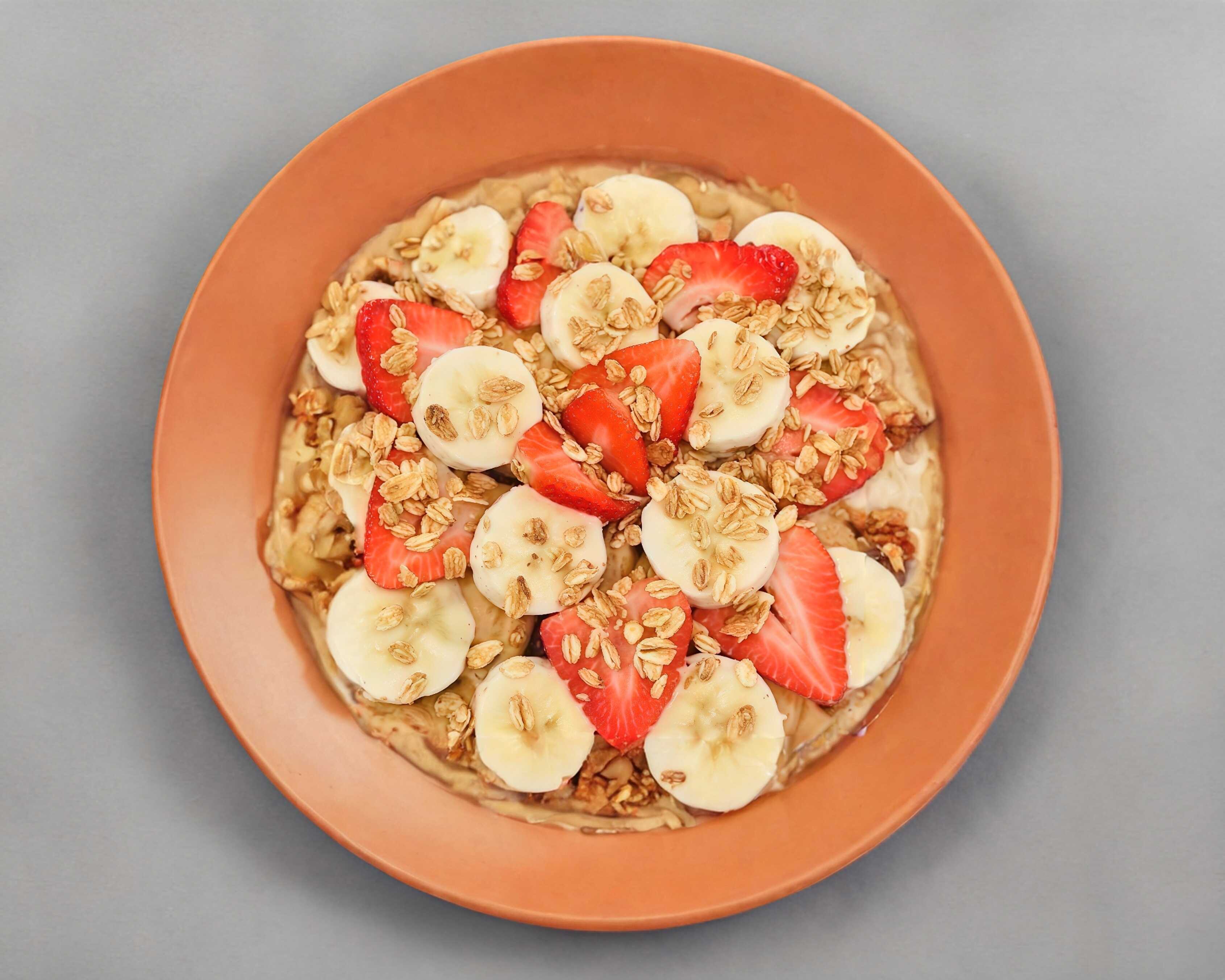 Fresa, plátano, granola, cacao orgánico y hemp.