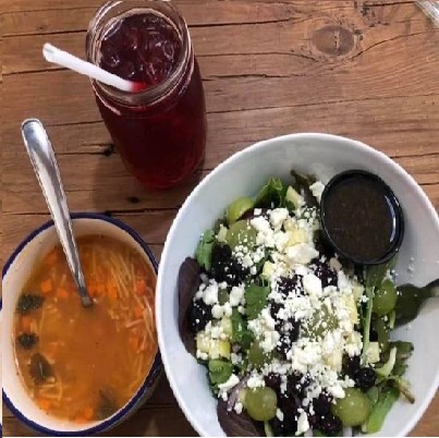 Manzana, uvas, arándanos, pimiento rojo, cebolla morada, cilantro con un toque de habanero y mix de verduras.