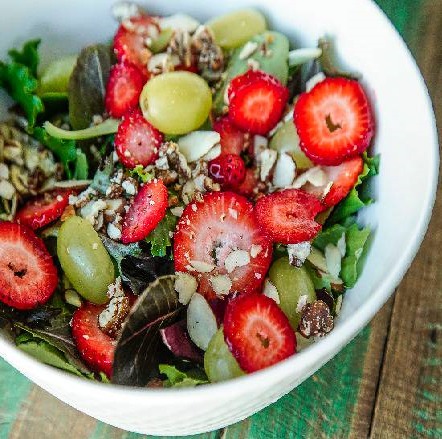 Nueces garapiñadas, uva, fresa, almendra y mix de verduras.