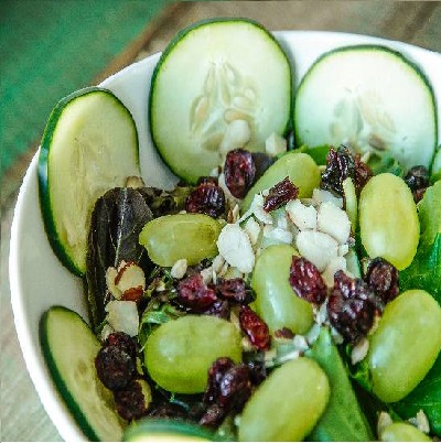 Arándanos, semilla de girasol, almendra, pepino, uva y mix de verduras.