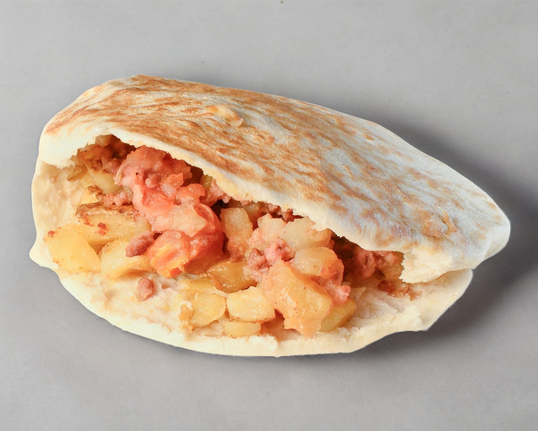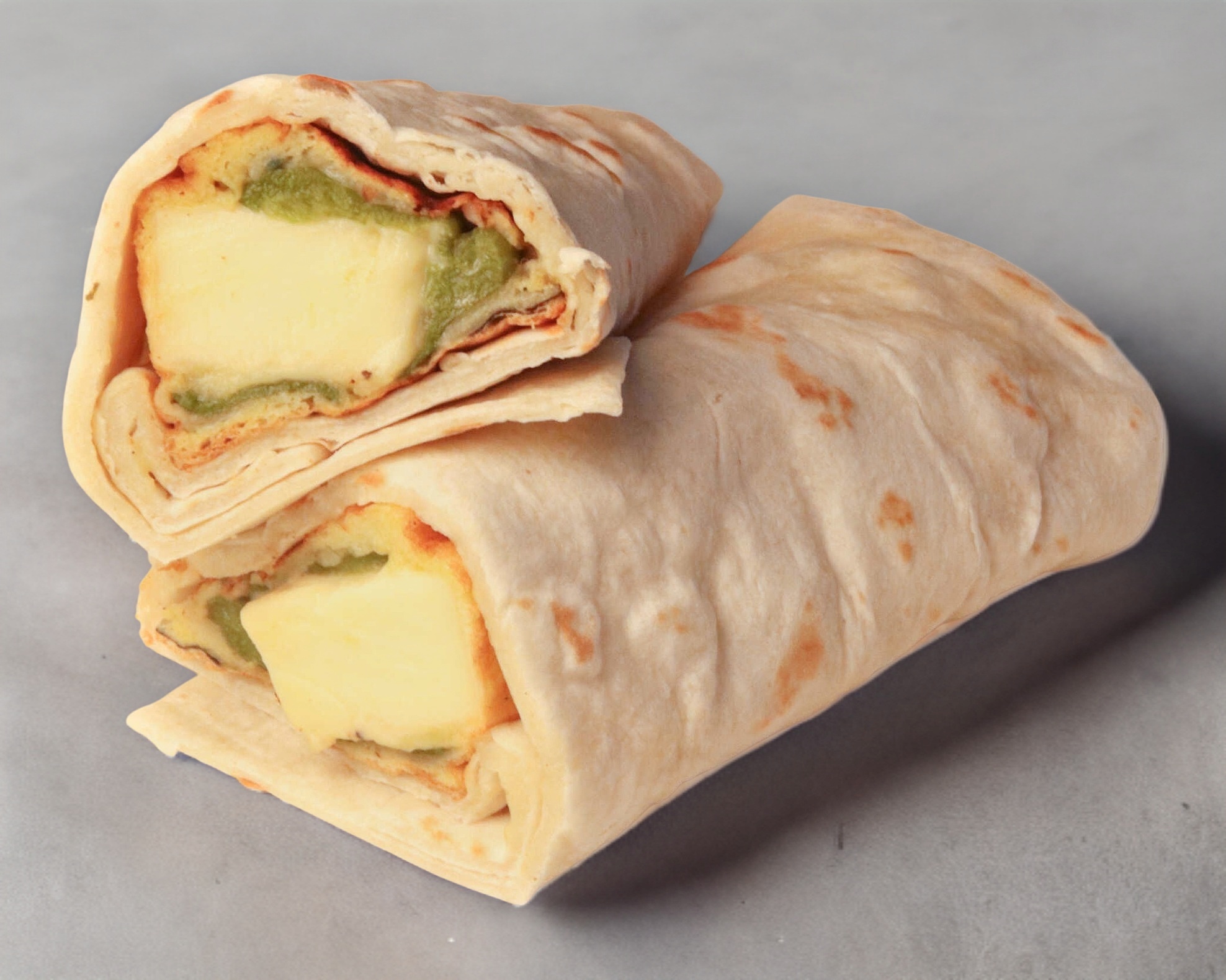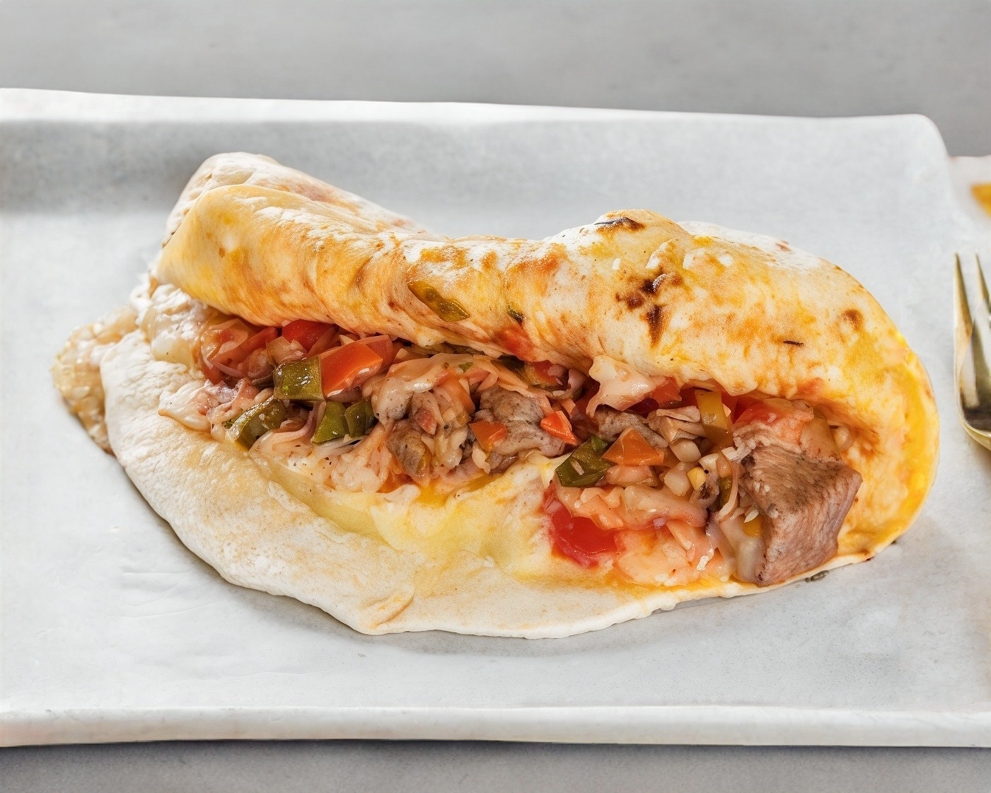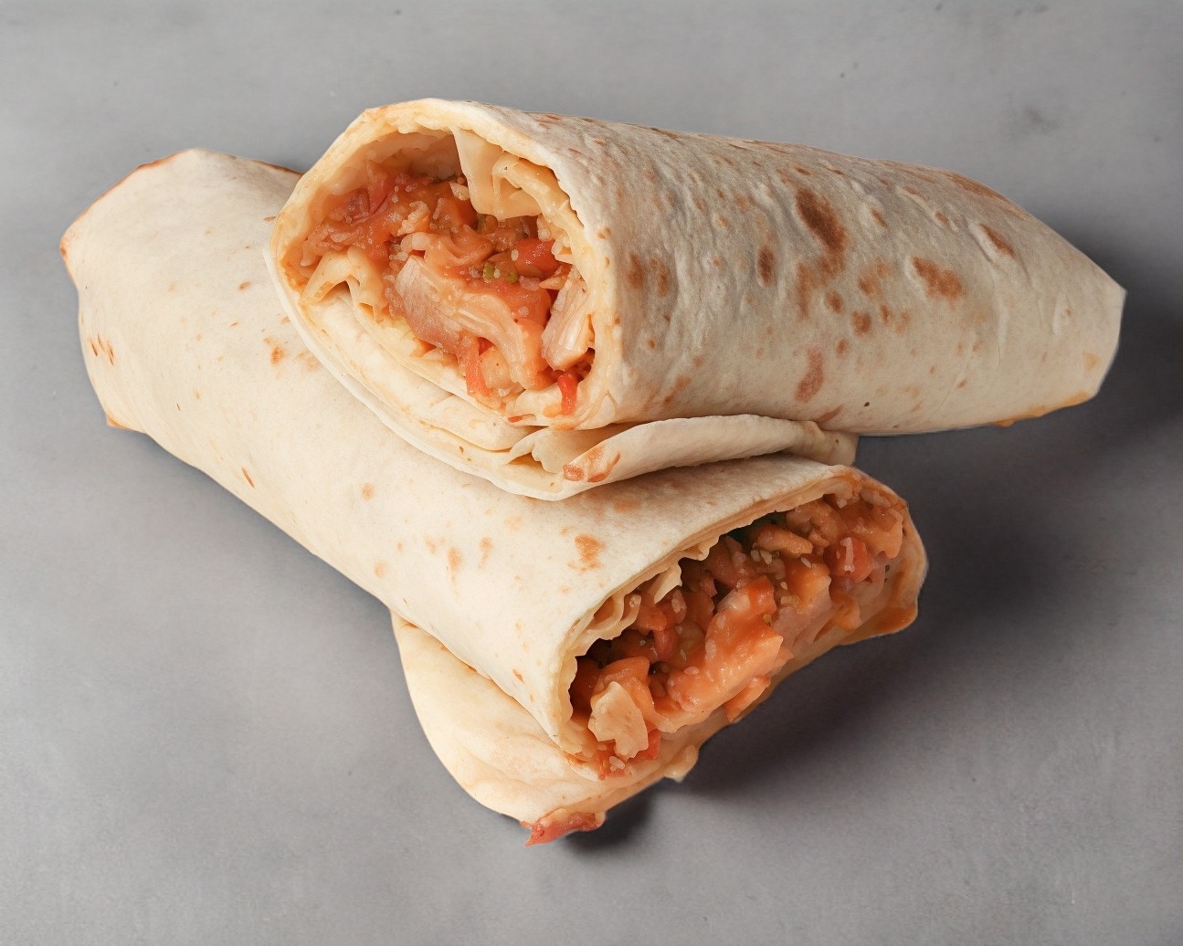 El burrito incluye tortilla de harina, milanesa, frijoles, aguacate y salsa roja.