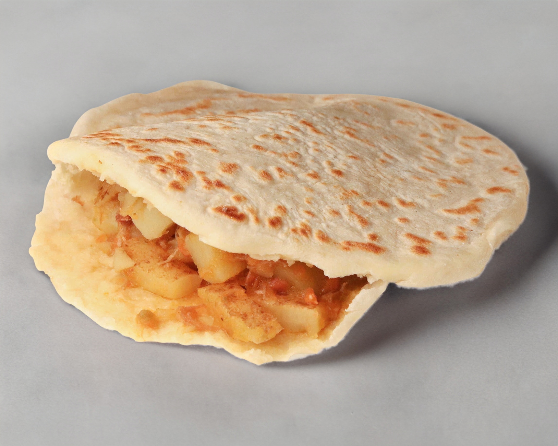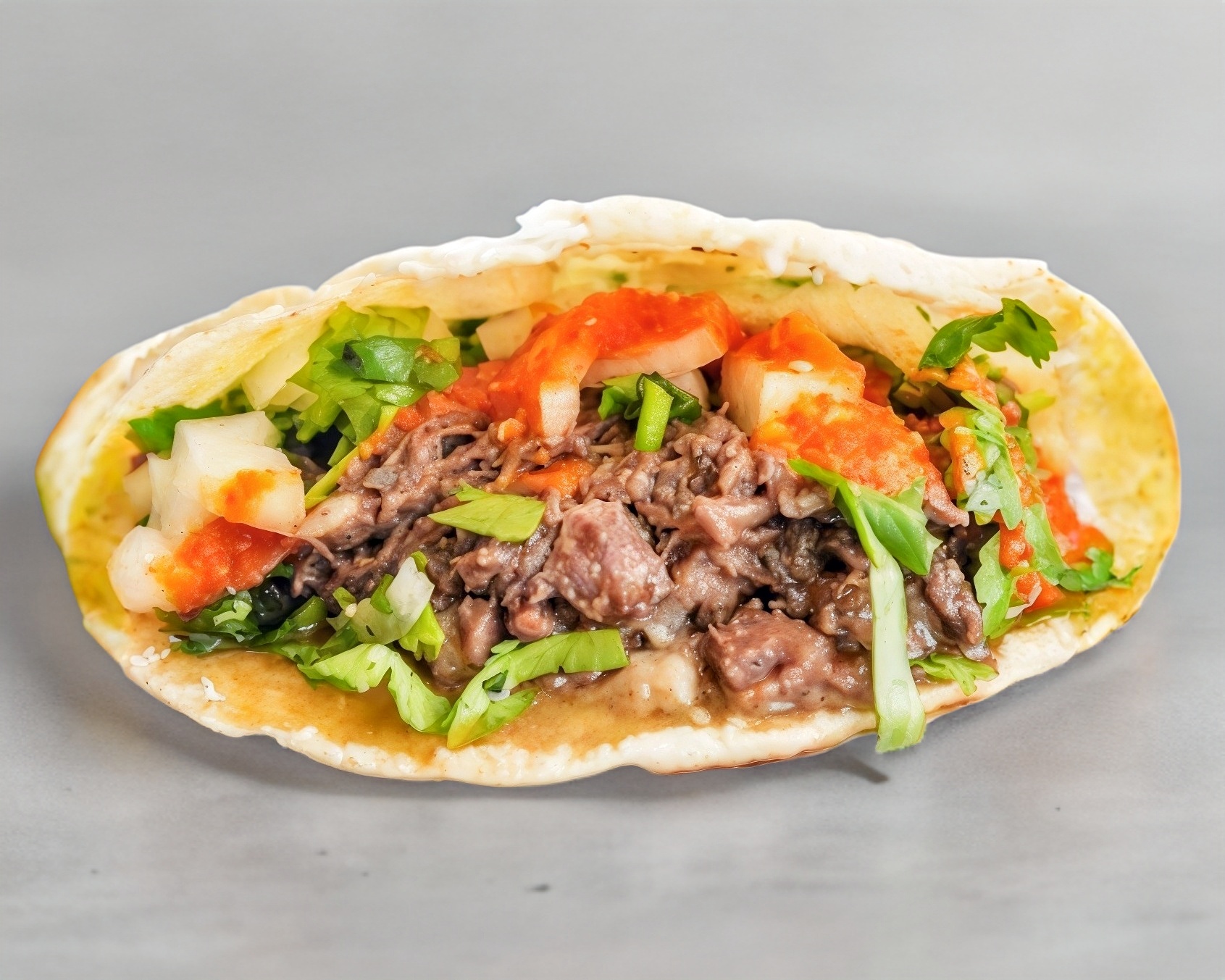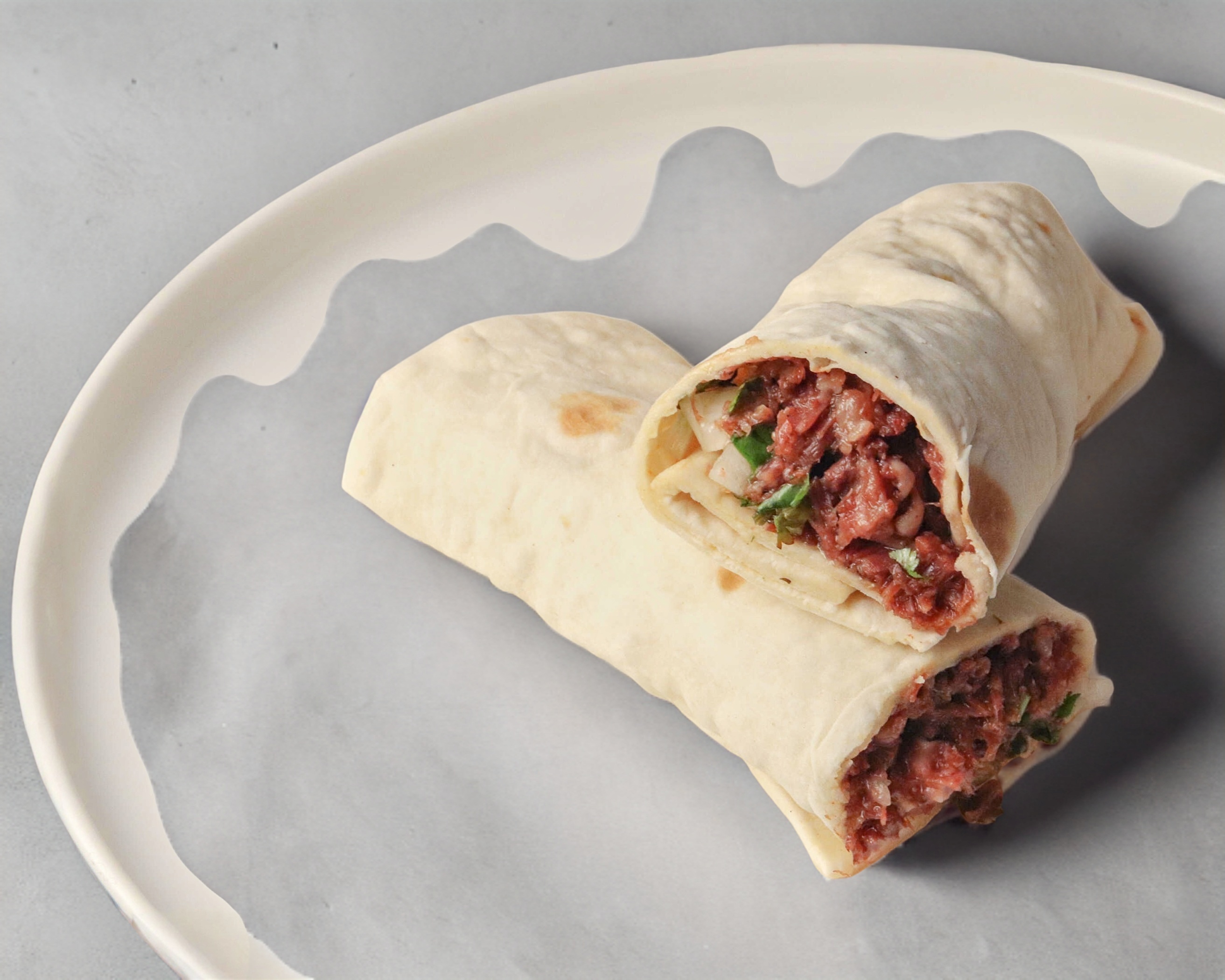 Tortilla de harina rellena de barbacoa, cilantro, cebolla y salsa roja. Se envía en una pieza.