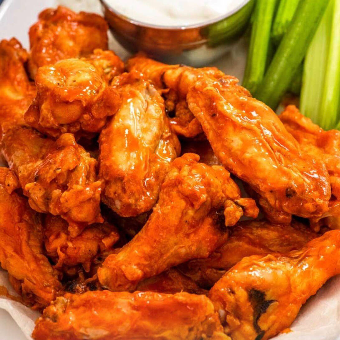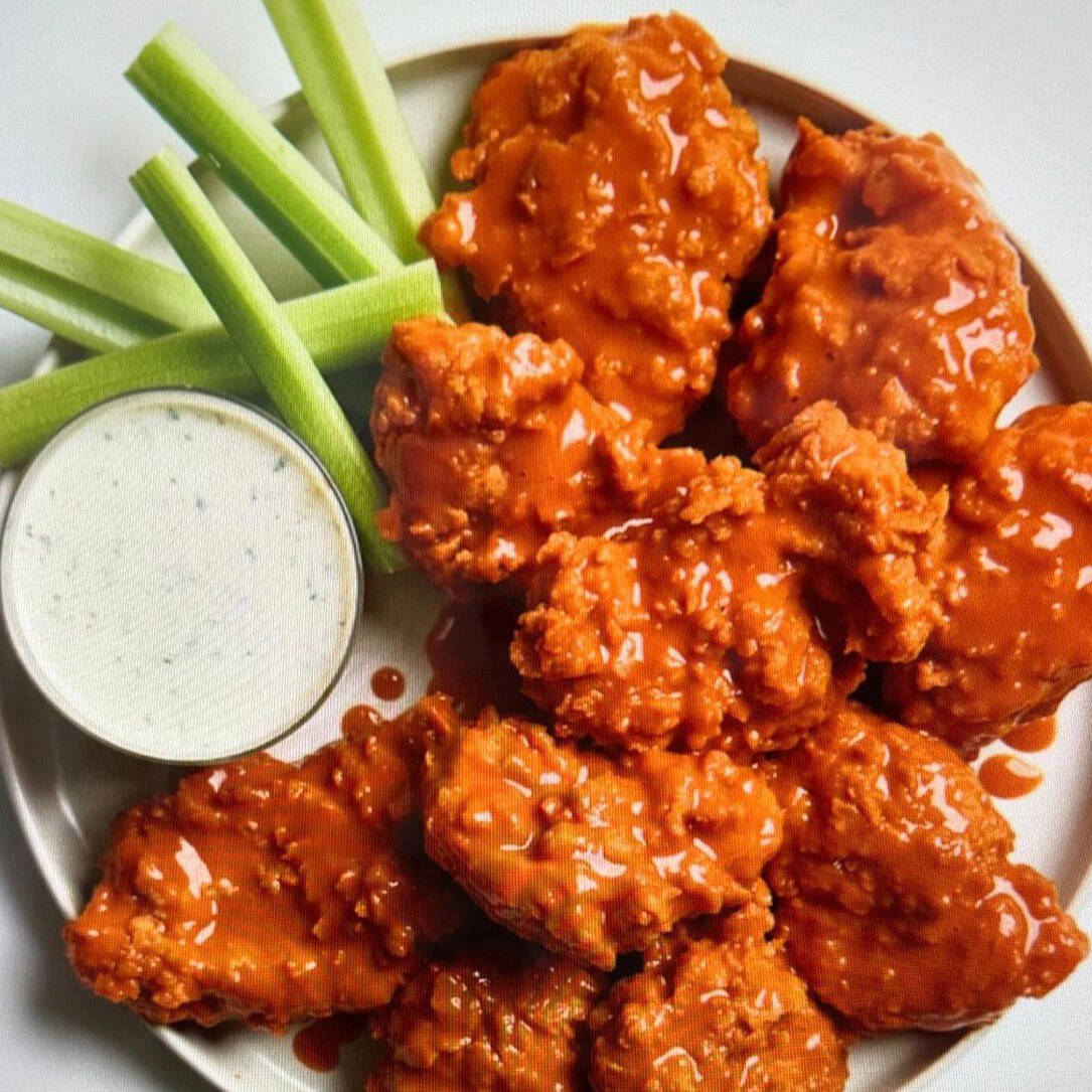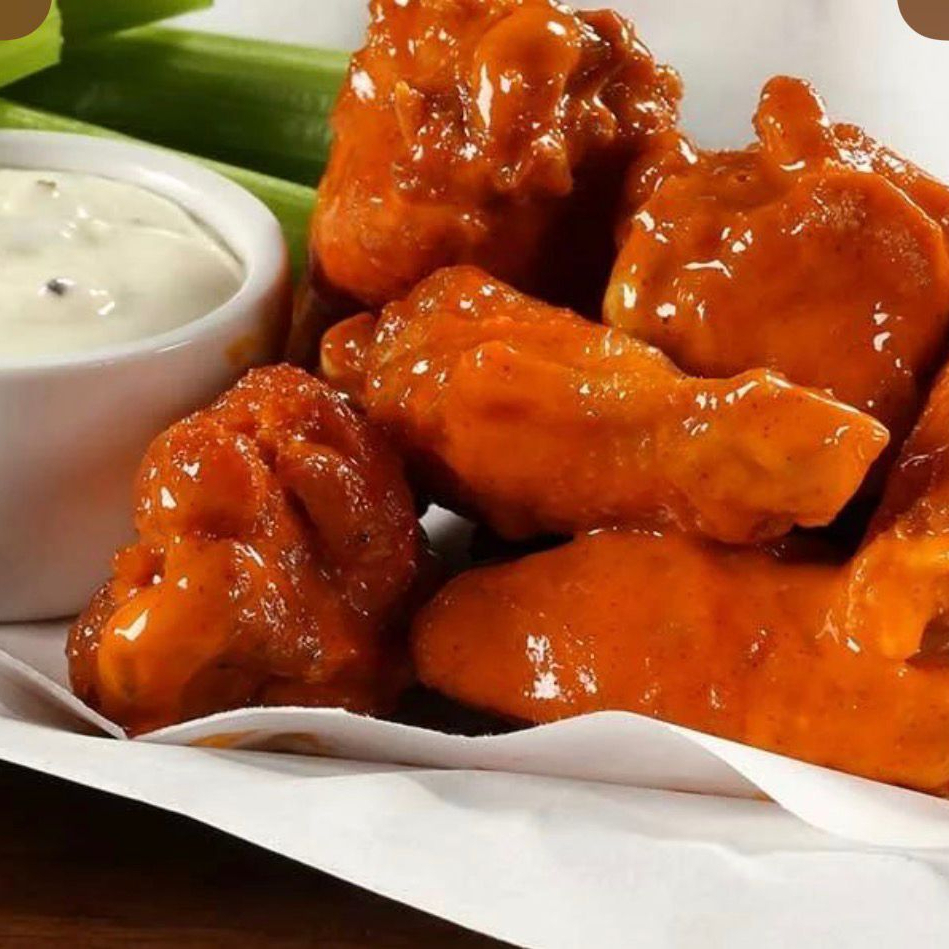 10 pzas De alitas sabor búfalo acompañados con su ranch y su verdura.