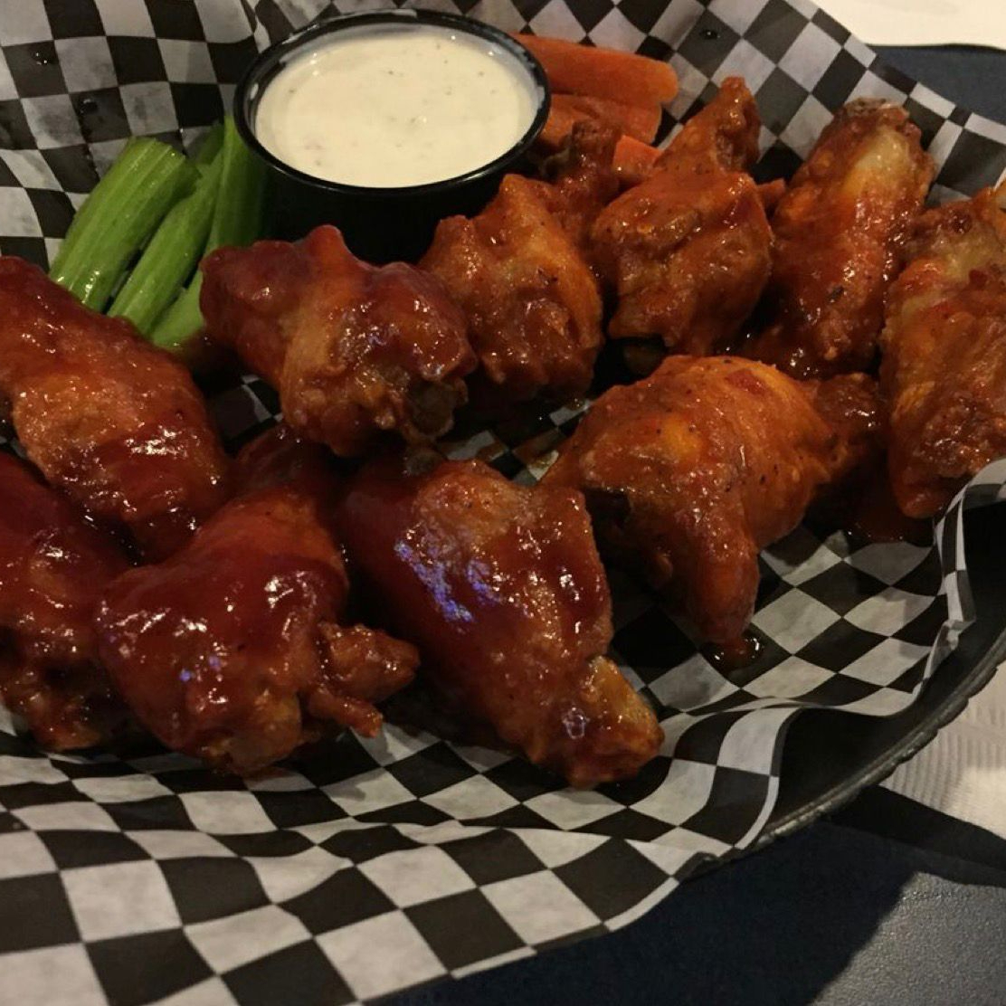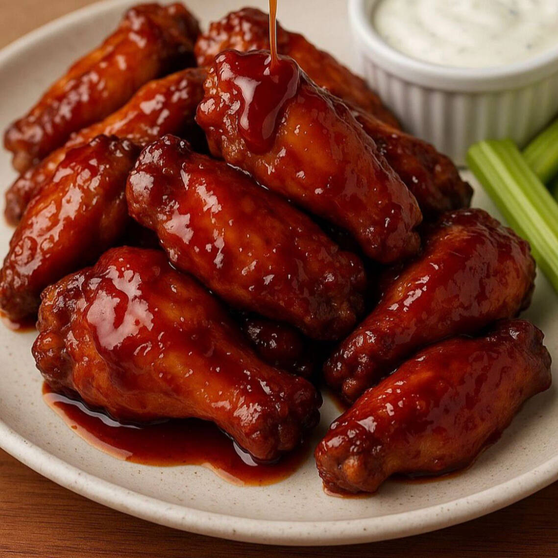 10 pzas De alitas sabor BBQ acompañadas con su ranch y sus verduras.