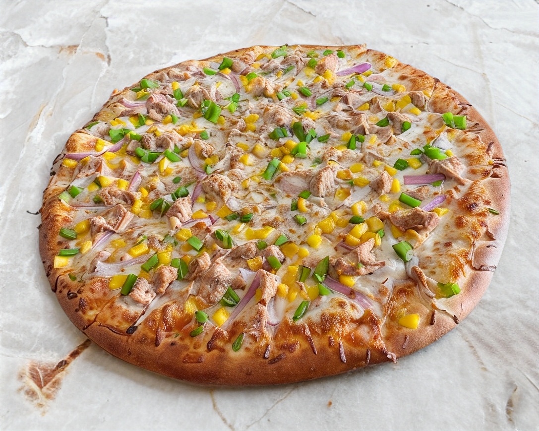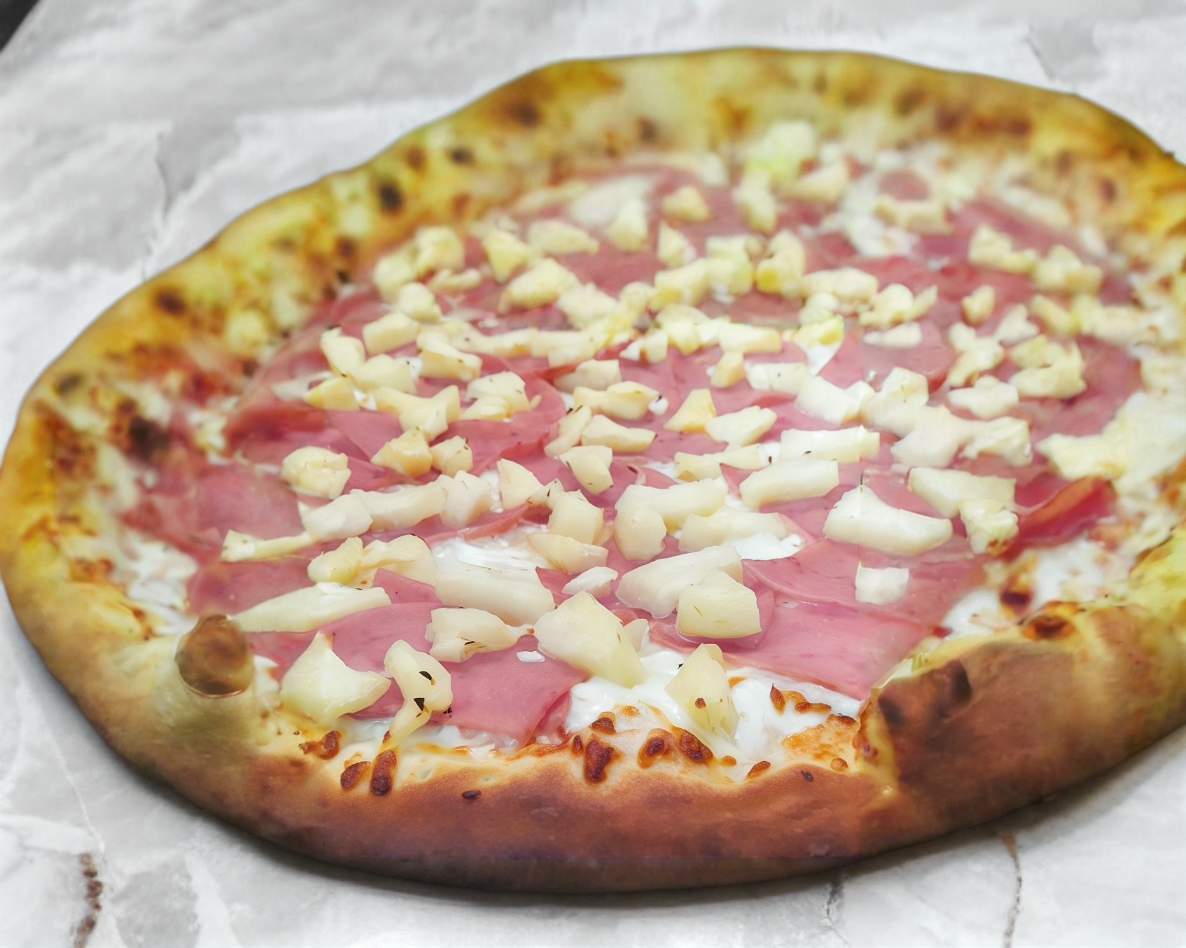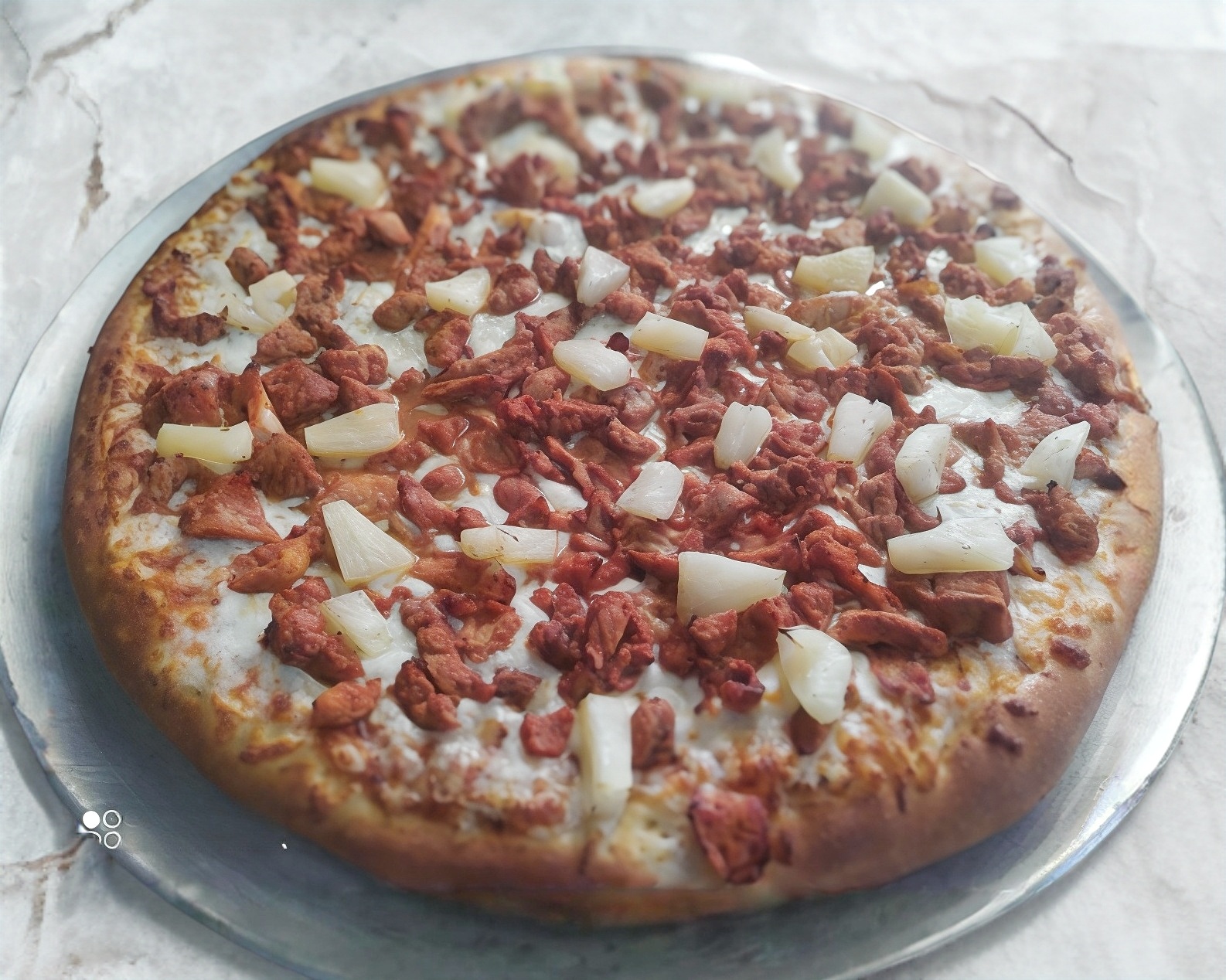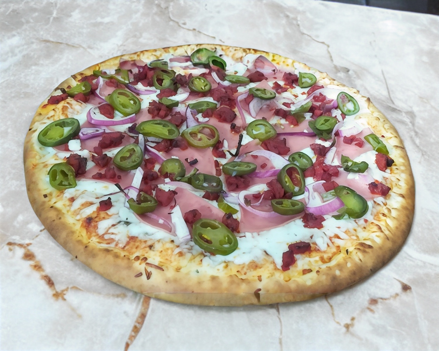 pizza grande con jamón, chorizo, cebolla y jalapeño.
