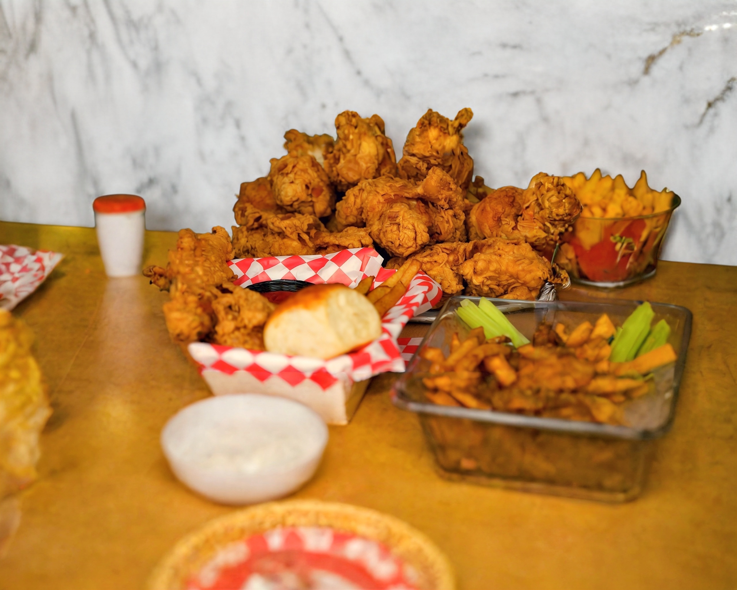 15 piezas de alitas bañadas en la salsa de tu preferencia acompañadas de papas fritas, catsup y aderezo ranch