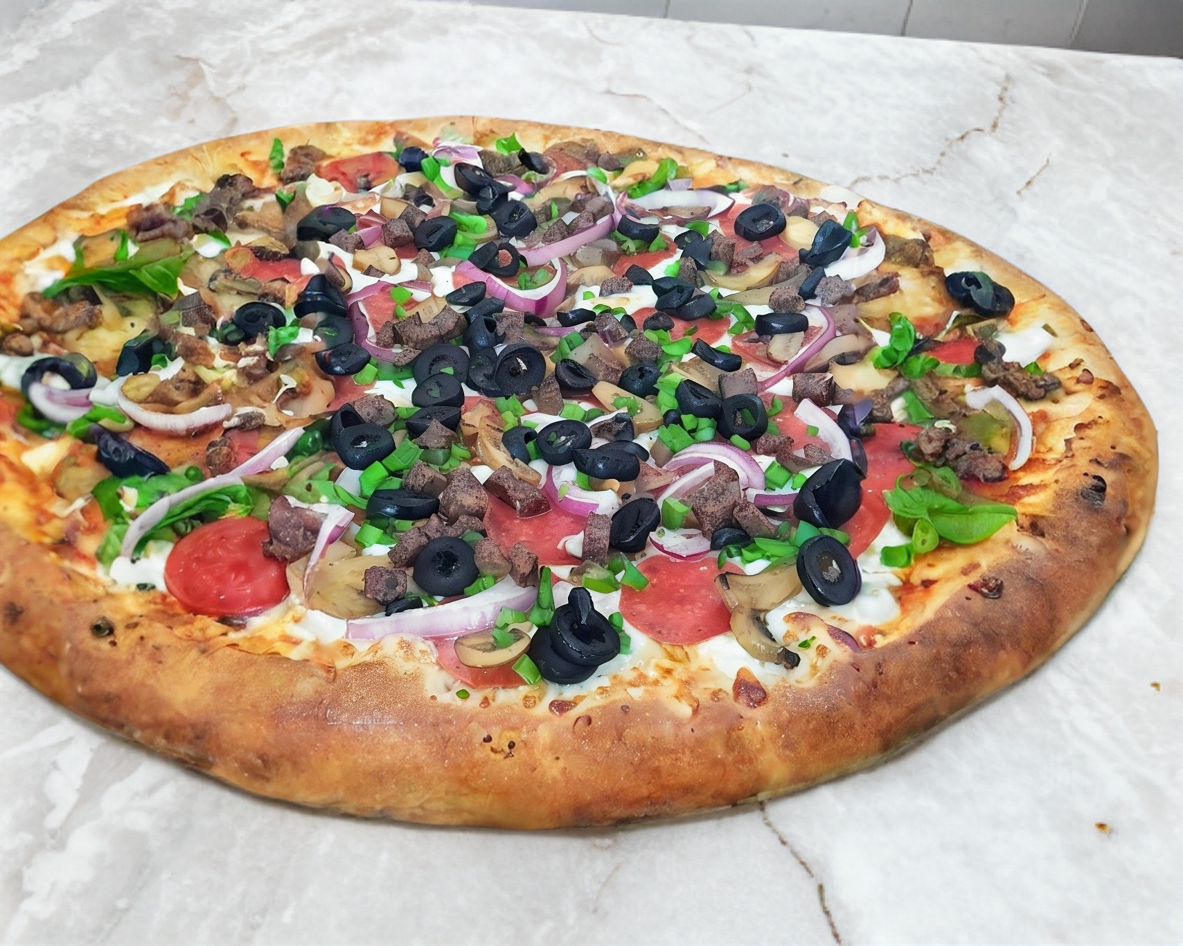 Pepperoni, salchicha italiana, champiñones, aceitunas, pimiento morron y cebolla.