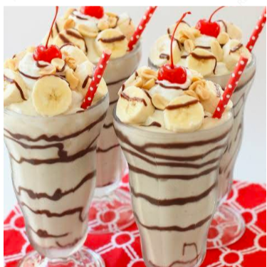 Plátano con crema, espuma, chocolate para elegir nuez o almendra.