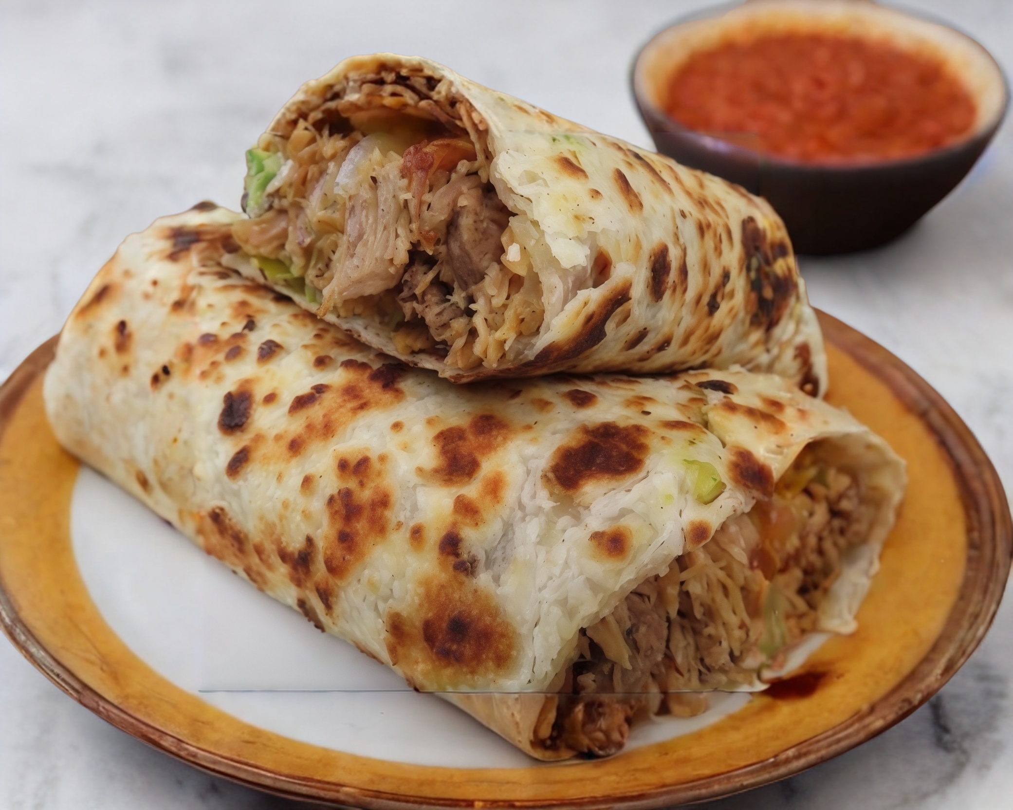 Tortilla de harina envuelta en guisado de carne de cerdo con salsa verde y frijoles.