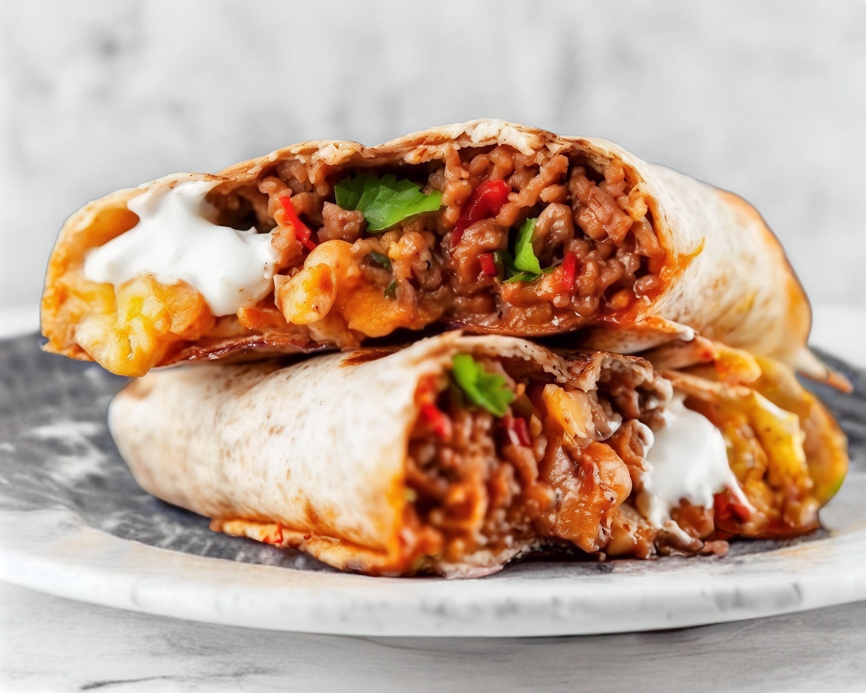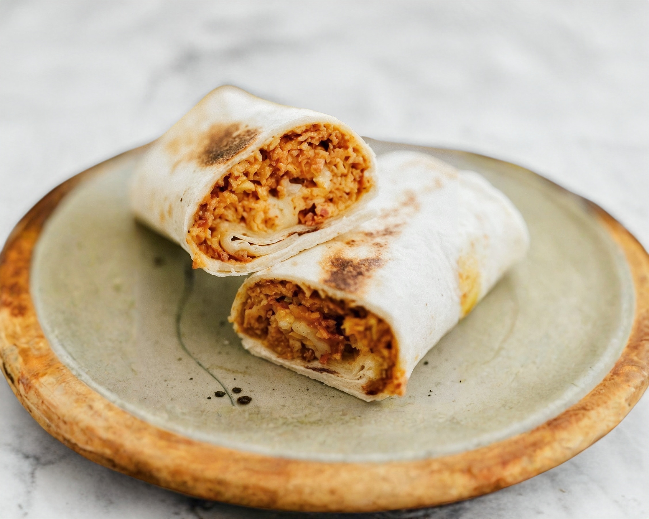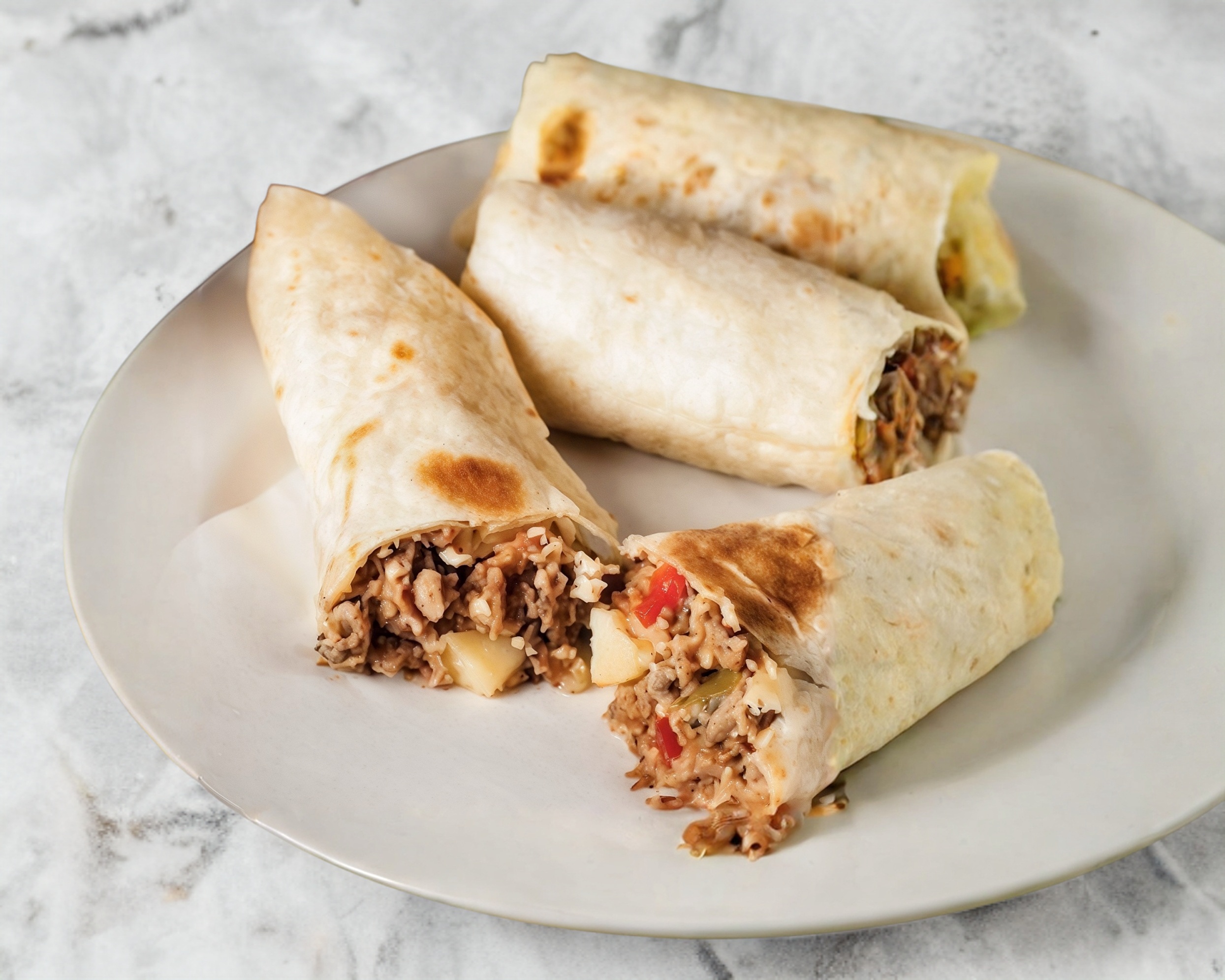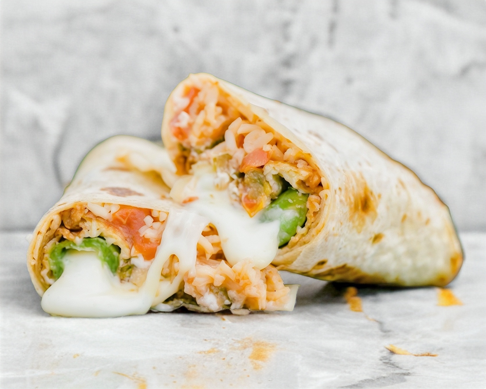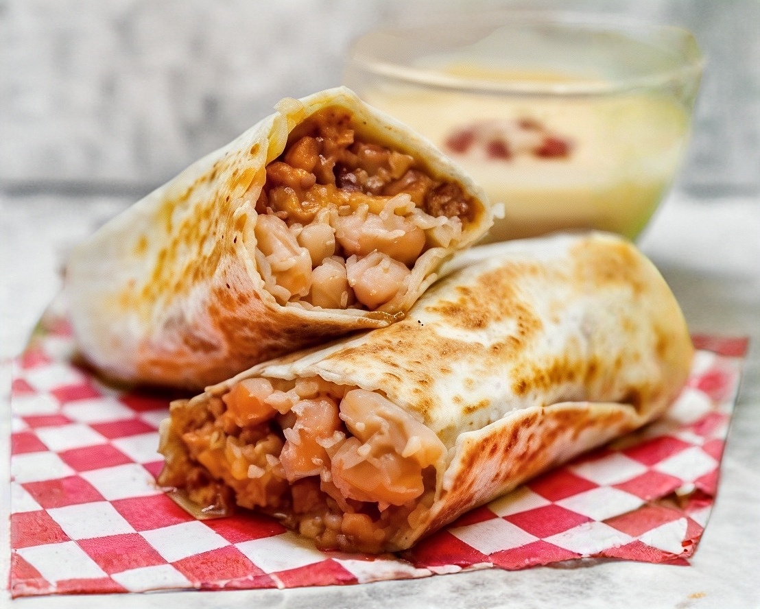 Tortilla de harina envuelta en guisado de frijoles con queso.