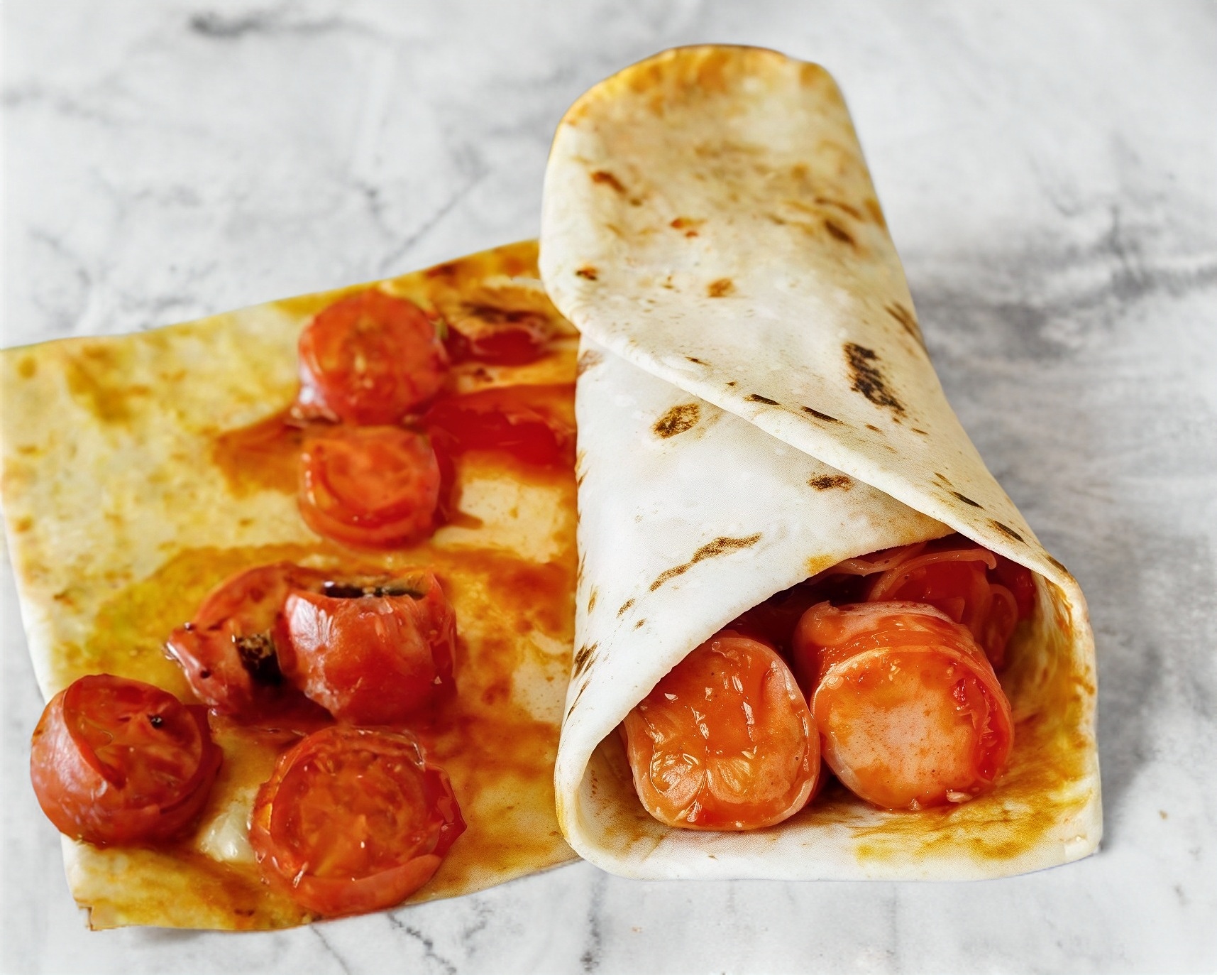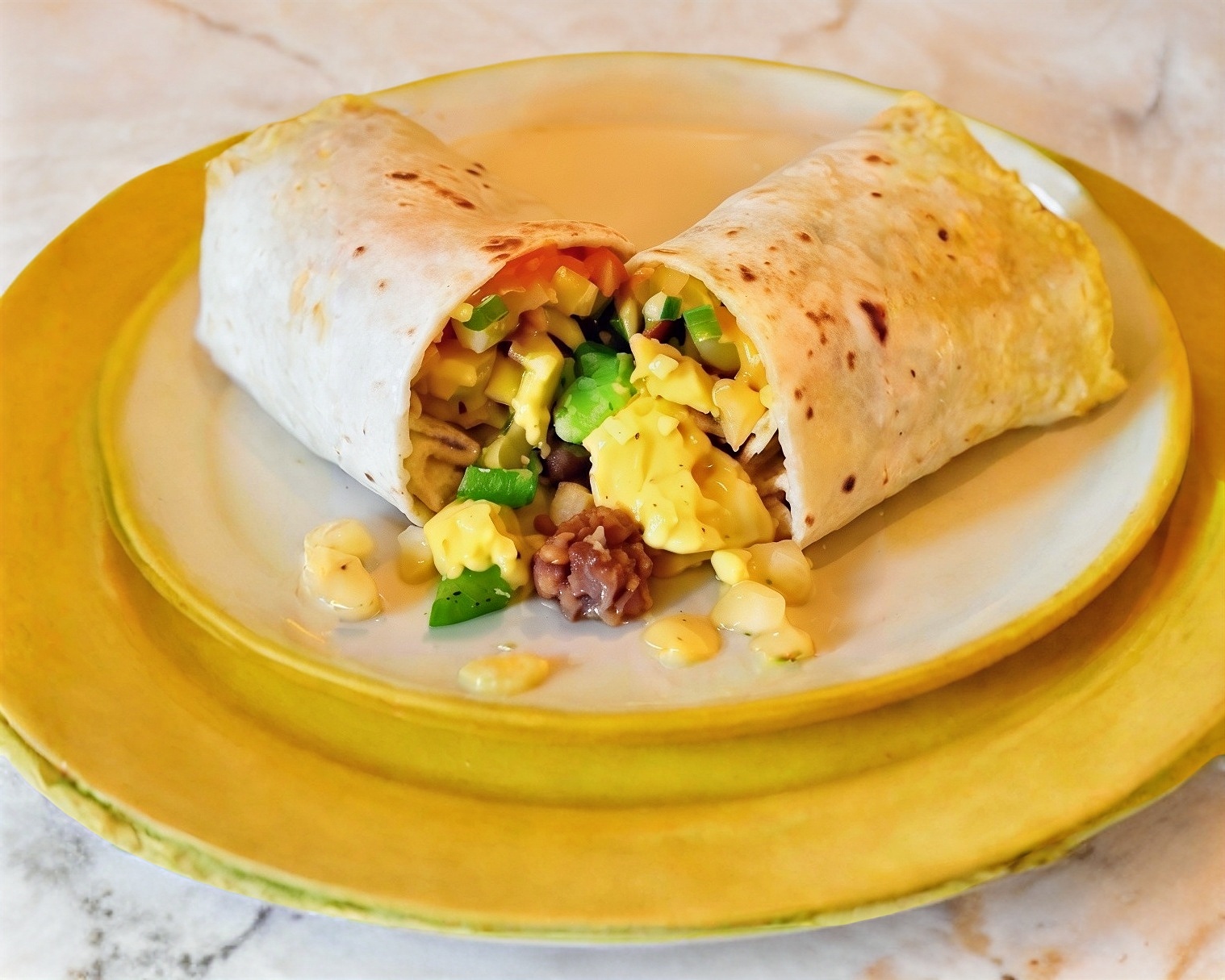 Tortilla de harina envuelta en guisado de huevo batido con chile, tomate y cebolla.