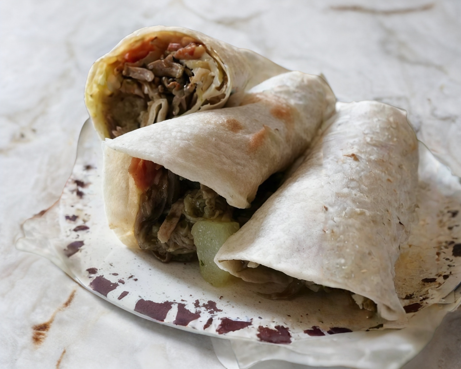 Tortilla de harina envuelta en guisado de deshebrada con chile, tomate y cebolla.
