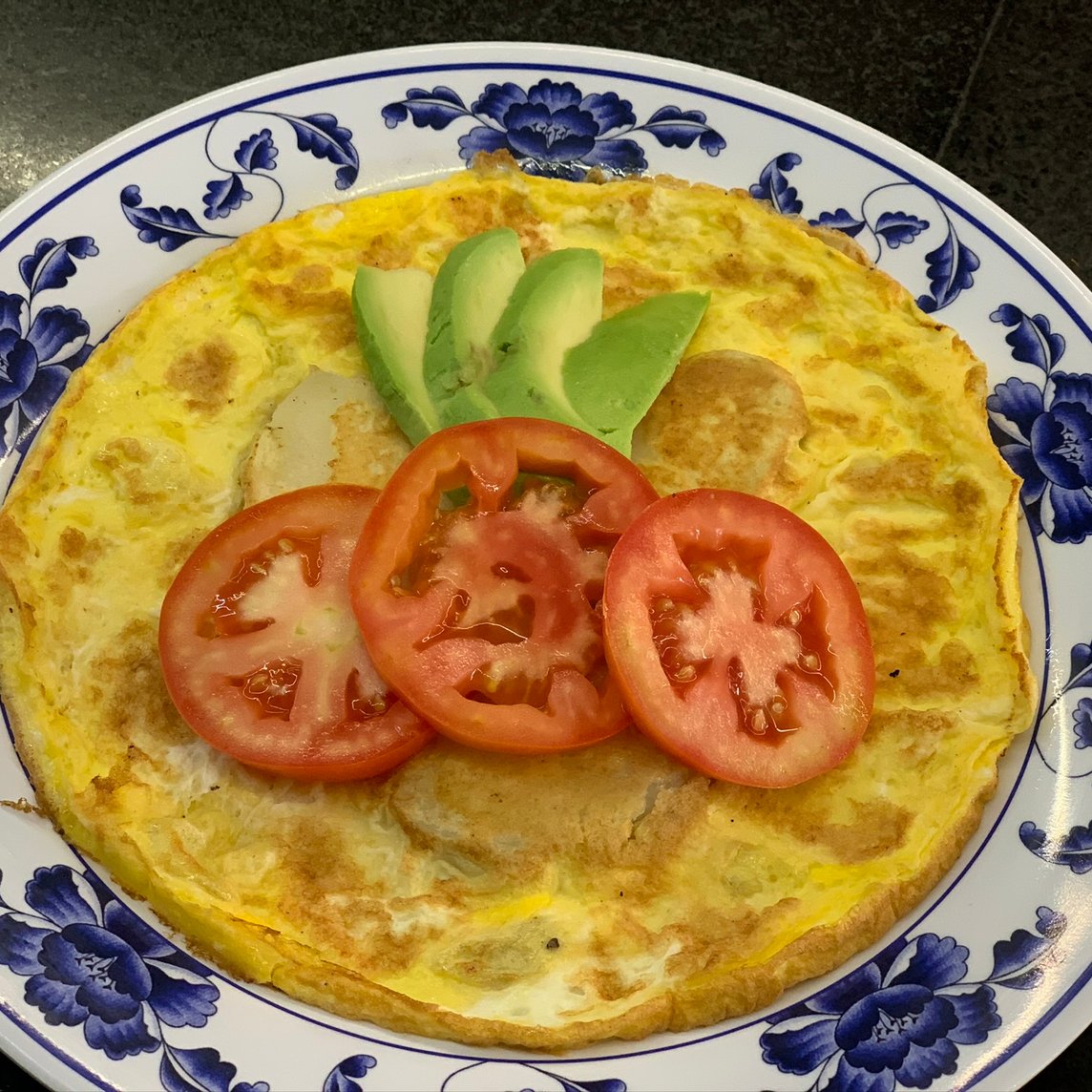 Torta de huevo rellena de rodajas de papa cocida con ebanadas de aguacate y tomate encima.