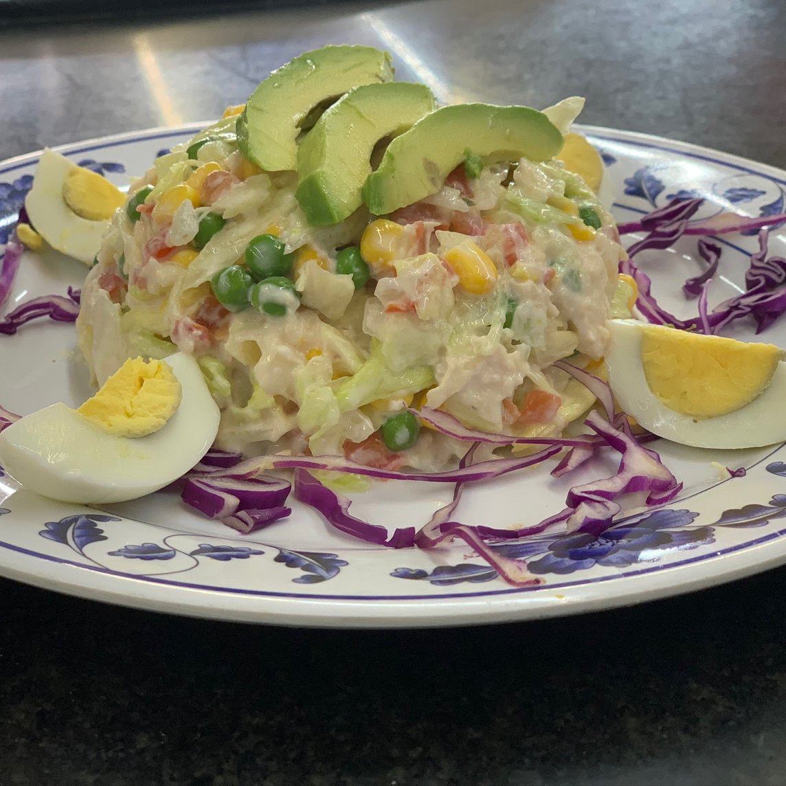 Pollo o atún, tomate, lechuga, elote y chícharos con mayonesa. Acompañada de aguacate y huevo cocido.