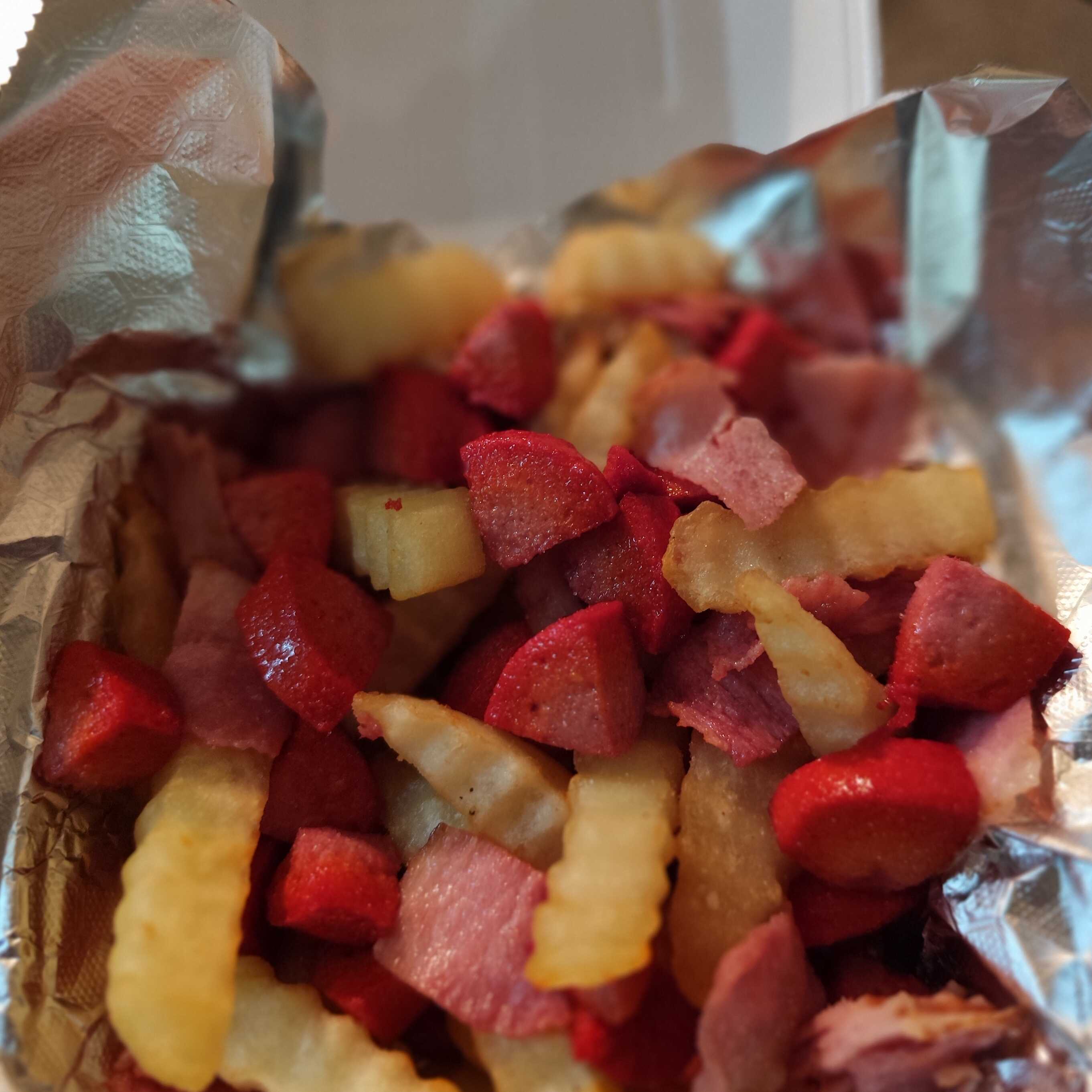 Orden de salchipapas c/tocino y queso