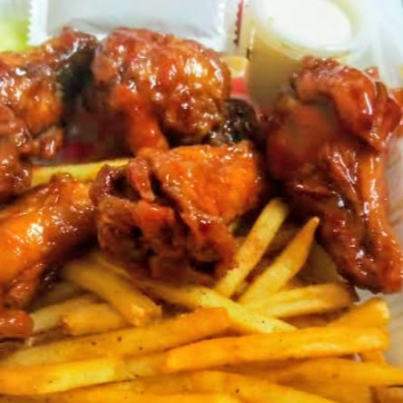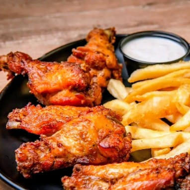 350gr de alitas con salsa a elegir, papas fritas, aderezo y cátsup