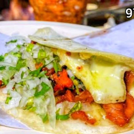 Tortilla de harina con carne al pastor, queso, aguacate, cebolla asada, cilantro y salsa verde.