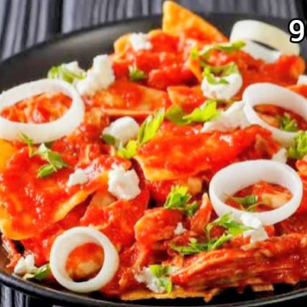 Tortilla de maíz frita en salsa roja con queso gratinado, cebolla y cilantro.